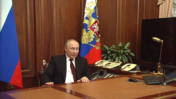 Σε τηλεοπτικό του διάγγελμα, αργά το βράδυ της Δευτέρας, ο Πούτιν, ως συνεπής εκπρόσωπος των απόψεων και των θέσεων της ρωσικής αστικής τάξης, η οποία επανήλθε στην εξουσία μετά τις αντεπαναστατικές ανατροπές που οδήγησαν στη διάλυση της ΕΣΣΔ, υποστήριξε ότι «η Ανατολική Ουκρανία είναι αρχαία ρωσική γη» και πως η σύγχρονη Ουκρανία είναι δημιούργημα της λενινιστικής πολιτικής περί αυτοδιάθεσης των λαών, που -σύμφωνα πάντα με τον Πούτιν- στόχο είχε την εδραίωση της επανάστασης, αλλά τελικά δημιούργησε εθνικιστικά στοιχεία, τα οποία διατηρήθηκαν και ενισχύθηκαν στη συνέχεια από τις «σταλινικές διώξεις» και άλλες «λάθος επιλογές» των μετέπειτα σοβιετικών ηγεσιών.