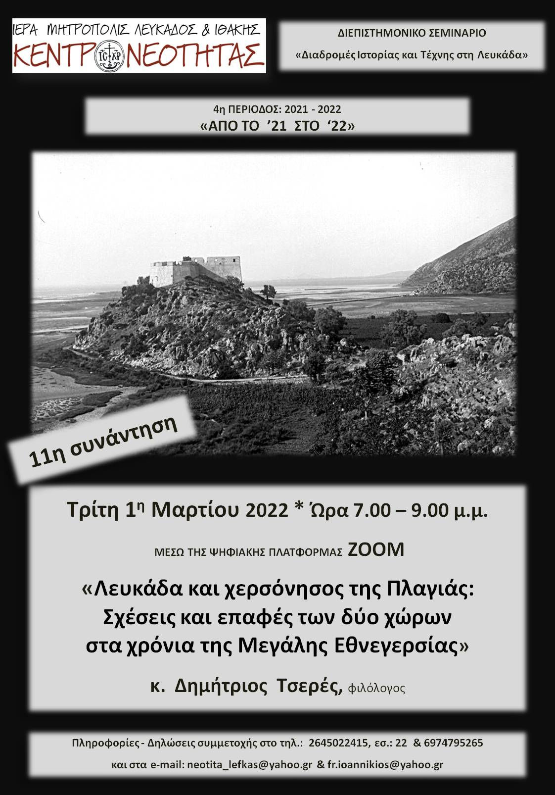 Την Τρίτη 1 Μαρτίου 2022 και ώρα 7.00-9.00 μ.μ. θα πραγματοποιηθεί μέσω της ψηφιακής πλατφόρμας ΖΟΟΜ η 11η Συνάντηση του διεπιστημονικού σεμινάριο με τίτλο: «Διαδρομές Ιστορίας και Τέχνης στη Λευκάδα» που διοργανώνει το Κέντρο Νεότητας της Μητρόπολης Λευκάδας.