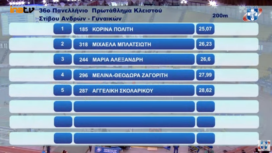 Με 25.07 η Λευκαδίτισσα πρωταθλήτρια του Γυμναστικού Συλλόγου Λευκάδας Κορίνα Πολίτη αναδείχθηκε σήμερα το πρωί εύκολα νικήτρια της 5ης προκριματικής σειράς (έτρεξε στον τέταρτο διάδρομο) για το αγώνισμα των 200 μ. και πήρε το εισιτήριο της απευθείας πρόκρισης για τον τελικό που θα διεξαχθεί το απόγευμα της Κυριακής 27 Φλεβάρη 2022, στις 6.50 μ.μ, στο Στάδιο Ειρήνης και Φιλίας, στο πλαίσιο του 36ου Πανελλήνιου Πρωταθλήματος κλειστού στίβου.