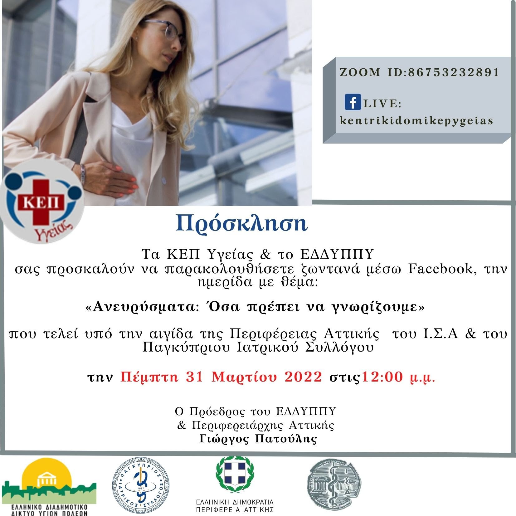 Το Δημοτικό Κέντρο Πρόληψης Υγείας Δήμου Πρέβεζας σας προσκαλεί σε Διαδικτυακή Δράση των ΚΕΠ Υγείας, με θέμα «Πρόληψη Ανευρύσματος Κοιλιακής Αορτής, θεραπεία μικρής διαμέτρου ανευρυσμάτων, Καρδιαγγειακά νοσήματα «Όσα πρέπει να γνωρίζουμε», που θα πραγματοποιηθεί την Πέμπτη 31 Μαρτίου, στις 12.00 μμ.