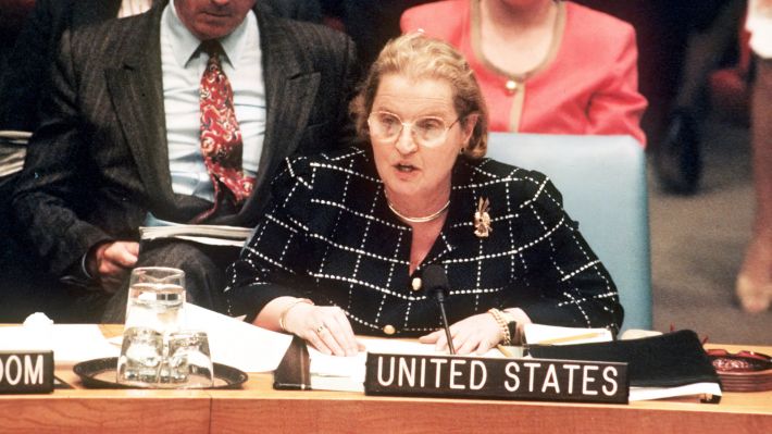 Στις 12 Μάη 1996, ούσα πρέσβης των ΗΠΑ στον ΟΗΕ, η Ολμπράιτ είχε δώσει συνέντευξη στην εκπομπή «60 minutes», σχετικά με τις φονικές κυρώσεις των ΗΠΑ σε βάρος του λαού του Ιράκ, όπου ερωτήθηκε από τη δημοσιογράφο Λέσλεϊ Σταλ: «Έχουμε ακούσει ότι μισό εκατομμύριο παιδιά έχουν πεθάνει. Θέλω να πω, είναι περισσότερα παιδιά από όσα πέθαναν στη Χιροσίμα. Νομίζετε ότι αξίζει αυτό το τίμημα;» και η Ολμπράιτ απάντησε: «Πιστεύουμε ότι αξίζει».