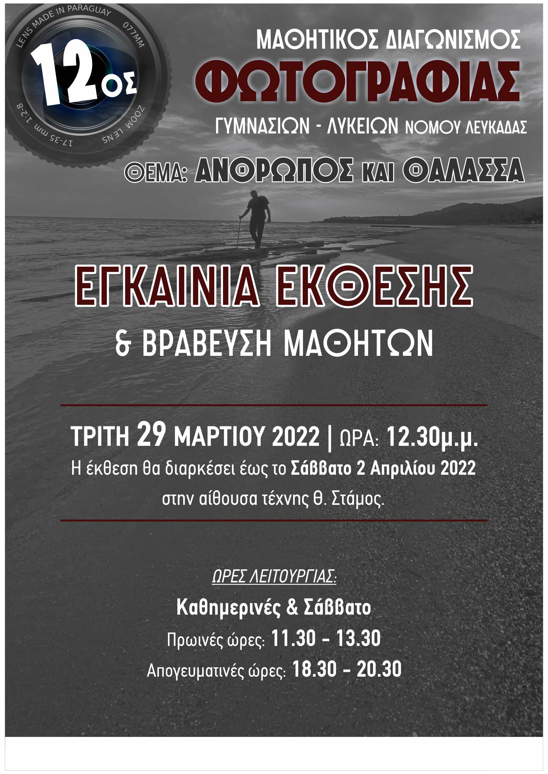 Την Τρίτη 29 Μαρτίου 2022, στις 12.30 μ.μ., στην αίθουσα τέχνης «Θ. Στάμος» (πλατεία Μαρκά) θα πραγματοποιηθούν τα εγκαίνια και η βράβευση των μαθητών του 12ου Μαθητικού Διαγωνισμού Φωτογραφίας Νομού Λευκάδας, με θέμα «Άνθρωπος και Θάλασσα».