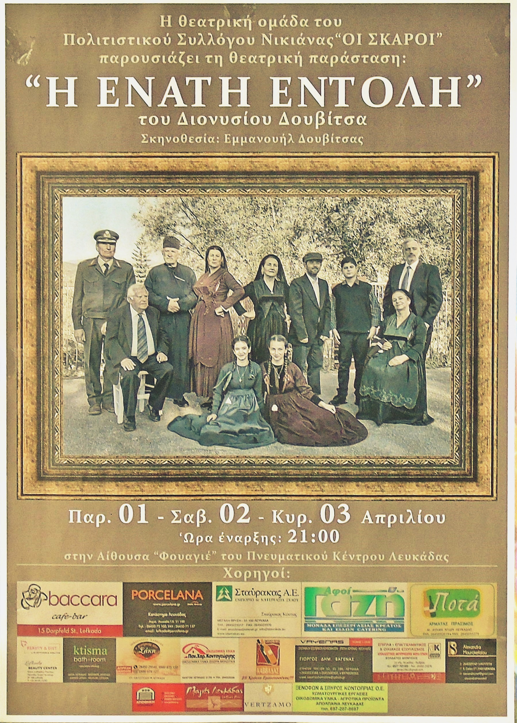 Κυκλοφόρησε η αφίσα με τους χορηγούς για την θεατρική παράσταση «Η ενάτη εντολή» του Διονύση Δουβίτσα (Πριονά) που θα παρουσιάσει σε σκηνοθεσία Μανώλη Δουβίτσα, στο Φουαγιέ του Πνευματικού Κέντρου του Δήμου Λευκάδας, τις τρεις πρώτες μέρες του Απρίλη (1, 2 και 3 Απρίλη 2022), στις 21:00, η θεατρική ομάδα του του Πολιτιστικού Συλλόγου Νικιάνας «οι Σκάροι».
