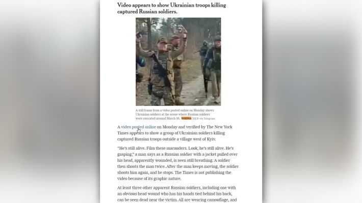 Οι «New York Times» έγραψαν προχτές ότι επιβεβαίωσαν την αυθεντικότητα βίντεο με σφαγή Ρώσων αιχμαλώτων και τραυματιών από ουκρανικές δυνάμεις, οι οποίοι έπεσαν σε ενέδρα κατά την αποχώρησή τους από το Κίεβο.