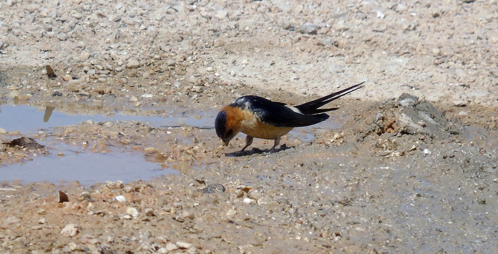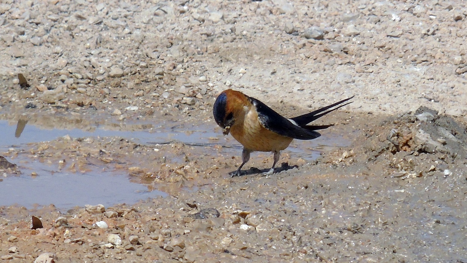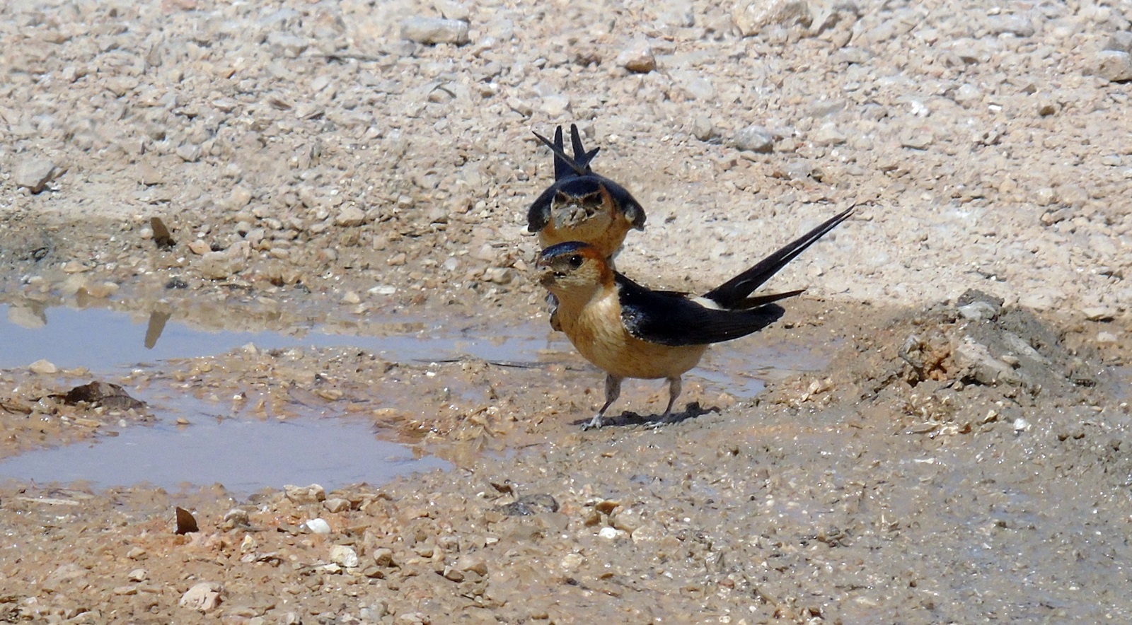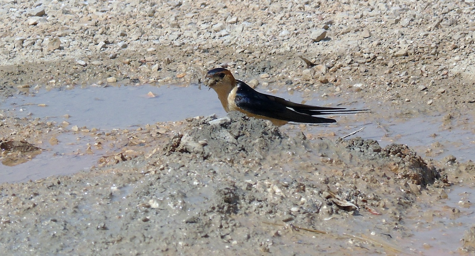 Αφού επιθεωρήσουν από ψηλά το χώρο και δουν ότι δεν υπάρχει κίνδυνος, προσγειώνονται κοντά στη λίμπα με τα λασπόνερα και με το κοντό και λεπτό τους ράμφος κάνουν από τη λάσπη κάθε φορά ένα μικρό σβώλο που τον μεταφέρουν για το χτίσιμο της φωλιάς τους που βρίσκεται σε κοντινή απόσταση.
