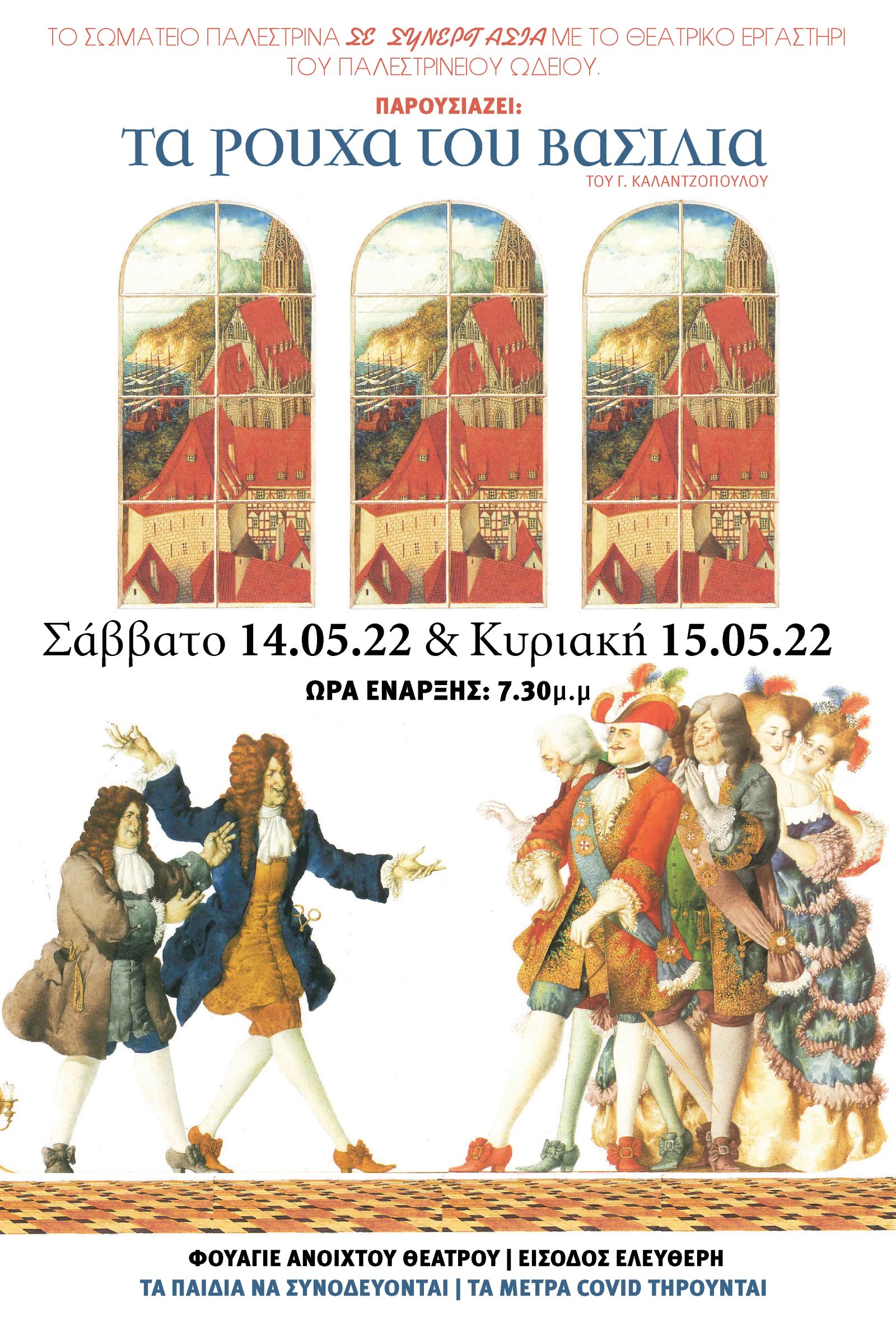 Το Σωματείο Παλεστρίνα, σε συνεργασία με το θεατρικό εργαστήρι του Παλεστρίνειου Ωδείου παρουσιάζουν, τη μουσικοθεατρική παράσταση «Τα Ρούχα του Βασιλιά» του Γ. Καλαντζόπουλου, σε σκηνοθεσία Ζωής. Λ. Σκιαδά και μουσική Γ. Μεσσήνη, στις: 14 κ 15/5/2022, ώρα 7.30 μ.μ., στο Φουαγιέ του Ανοιχτού Θεάτρου.