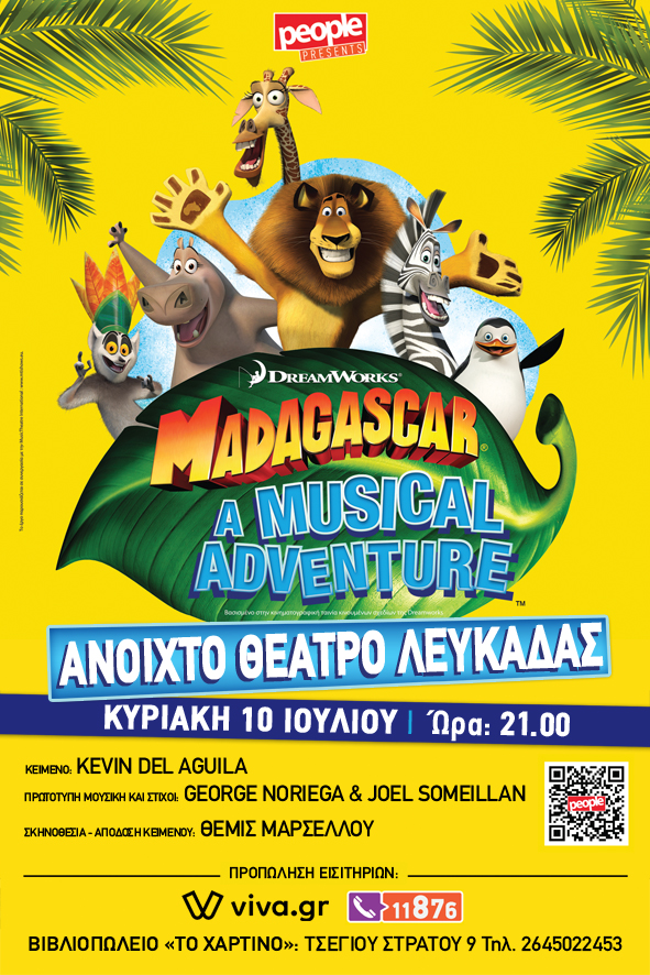 Το μιούζικαλ «Μαδαγασκάρη» ανεβαίνει στη σκηνή του Ανοιχτού Θεάτρου Λευκάδας την Κυριακή 10 Ιουλίου στις 21:30.