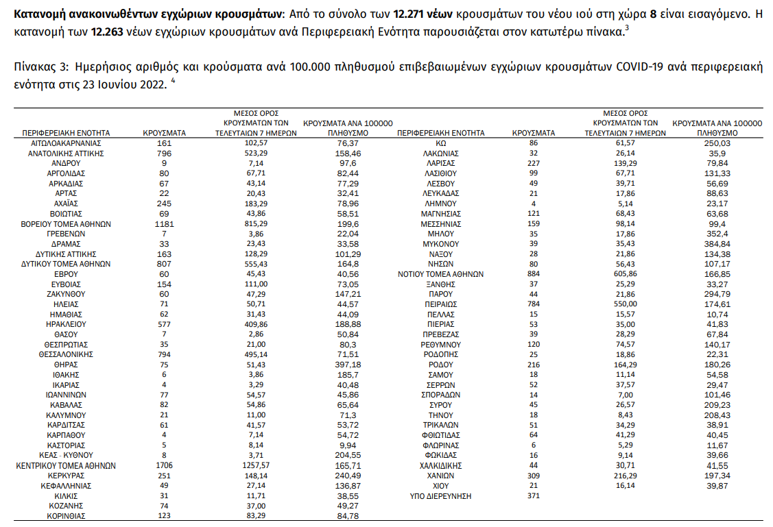 Συνολικά 12.271 επιβεβαιωμένα κρούσματα (10.474 νέα κρούσματα και 1.797 «πιθανές νέες επαναλοιμώξεις») ανακοινώθηκαν για το τελευταίο 24ωρο από τον ΕΟΔΥ. Με αυτά, ο συνολικός αριθμός των κρουσμάτων είναι 3.583.526.