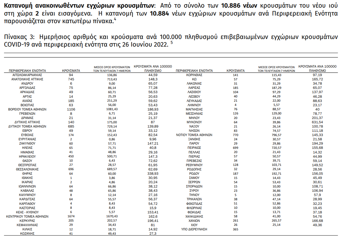 Συνολικά 10.886 επιβεβαιωμένα κρούσματα (9.294 νέα κρούσματα και 1.592 «πιθανές νέες επαναλοιμώξεις») ανακοινώθηκαν για το τελευταίο 24ωρο από τον ΕΟΔΥ. Με αυτά, ο συνολικός αριθμός των κρουσμάτων είναι 3.616.874.