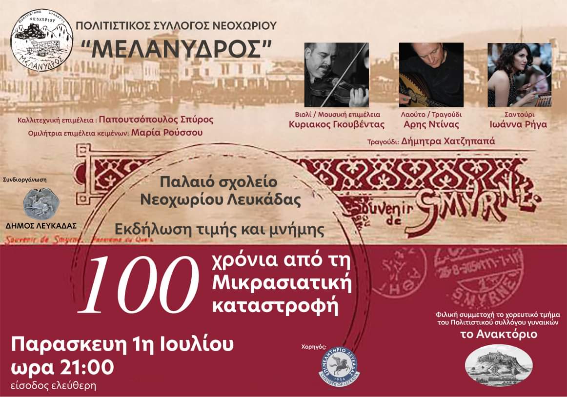 Ο πολιτιστικός Σύλλογος Νεοχωρίου ΜΕΛΑΝΥΔΡΟΣ σας προσκαλεί την Παρασκευή 1η Ιουλίου και ώρα 21:00 στο σχολείο στο Νιοχώρι σε ένα μουσικοχορευτικό αφιέρωμα με θέμα: 100 χρόνια από τη Μικρασιατική καταστροφή – οι πρόσφυγες στη Λευκάδα.