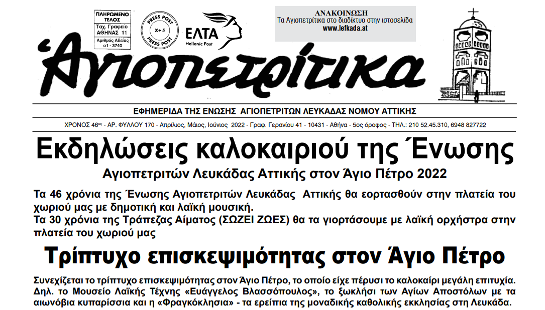 Κυκλοφόρησε το νέο 12σέλιδο 170ο φύλλο (Απρίλιος, Μάιος, Ιούνιος 2022) της εφημερίδας «Αγιοπετρίτικα» που εκδίδει η Ένωση Αγιοπετριτών Λευκάδας Νομού Αττικής, με επίκαιρα ζητήματα που αφορούν το χωριό και την ευρύτερη περιοχή.