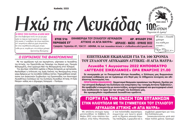 Κυκλοφόρησε το νέο φύλλο (Αριθ. Φύλλου 214, Απρίλιος, Μάιος, Ιούνιος 2022) της εφημερίδας «Ηχώ της Λευκάδας» που εκδίδει κάθε τρεις μήνες ο Σύλλογος Λευκαδίων Αττικής «Η Αγία Μαύρα».
