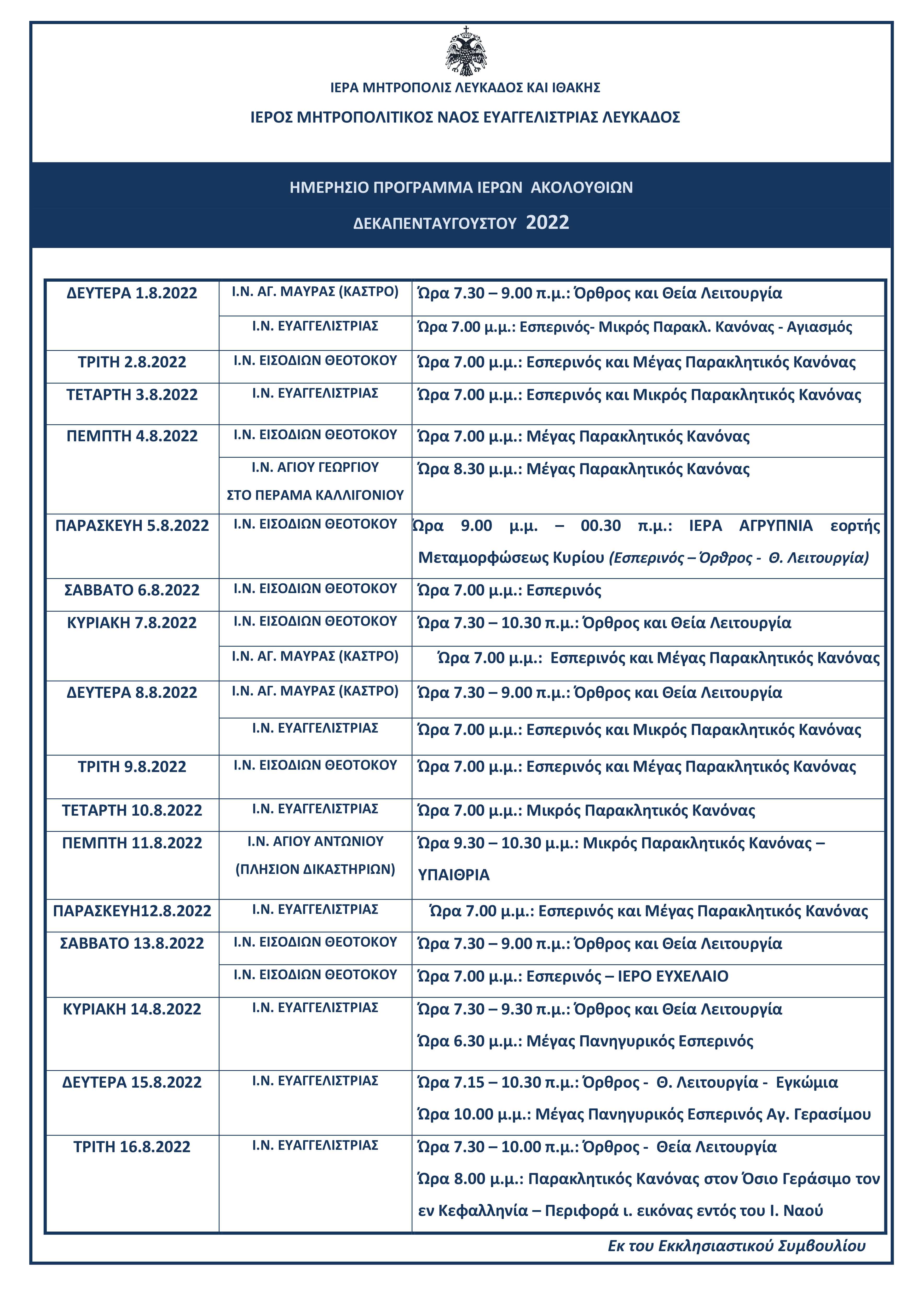 Πρόγραμμα ιερών ακολουθιών Δεκαπενταυγούστου ενορίας Ευαγγελιστρίας Λευκάδος