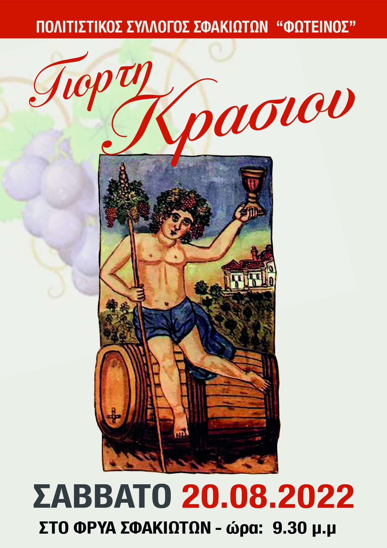 Ο Πολιτιστικός Σύλλογος Σφακιωτών «Φωτεινός» διοργανώνει το Σάββατο 20 Αυγούστου 2022 στις 9.30 μ.μ. στο Φρυά Σφακιωτών Γιορτή Κρασιού.