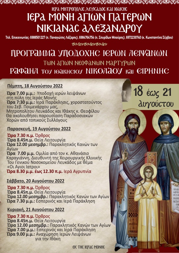 Η Ιερά Μητρόπολις Λευκάδος και Ιθάκης μετά πολλής χαράς ανακοινώνει στον ευσεβή λαό και τους επισκέπτες της Λευκάδος και των γύρω περιοχών ότι, συν Θεώ, την Πέμπτη 18 Αυγούστου 2022 θα υποδεχθούμε στο νησί της Λευκάδος τα χαριτόβρυτα λείψανα των Αγίων Ραφαήλ του Ιθακησίου, Νικολάου και Ειρήνης, προερχόμενα από τον Ιερό Ναό του Αγίου Ραφαήλ, που ευρίσκεται στη γενέτειρά του, Περαχώρι Ιθάκης.