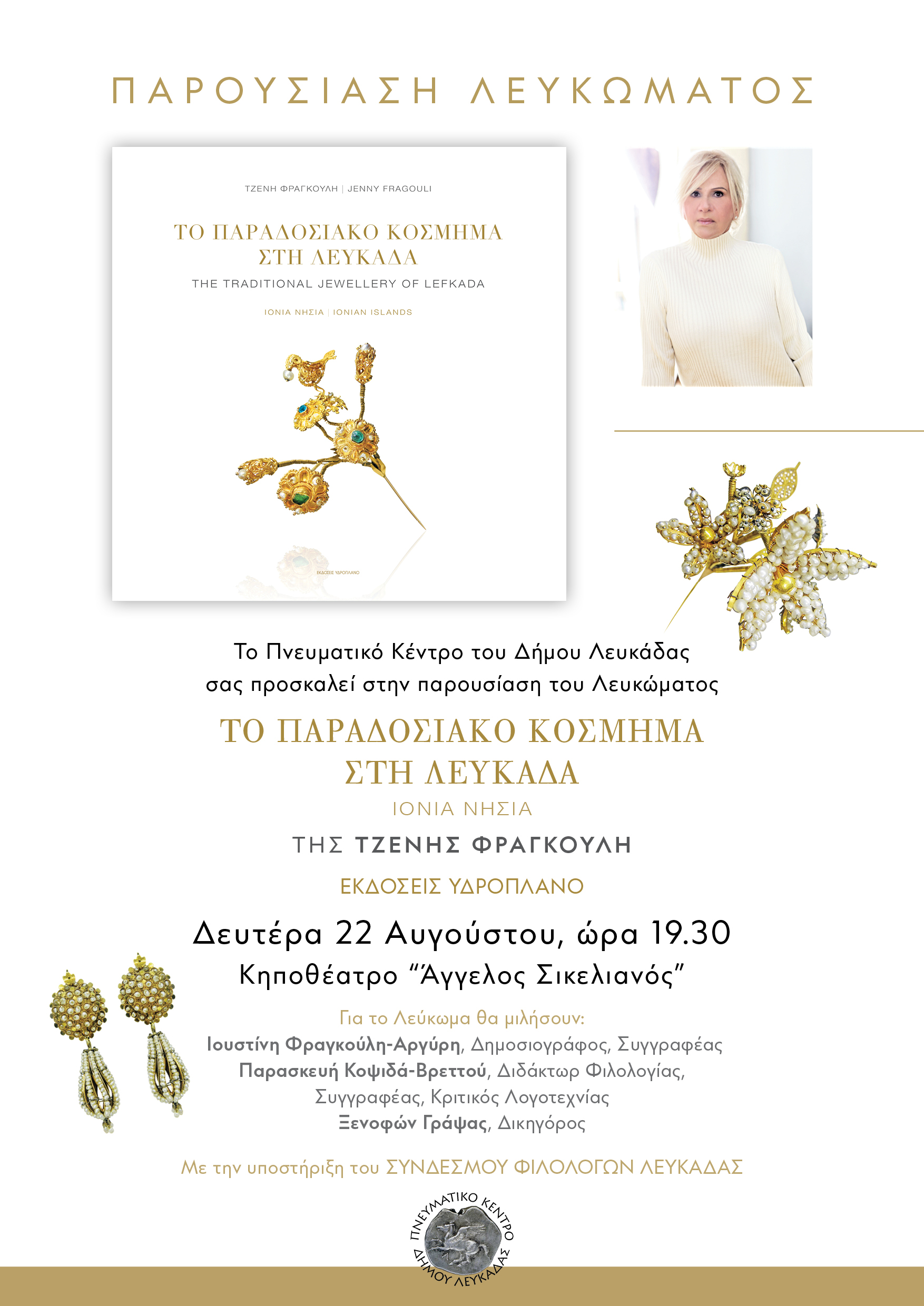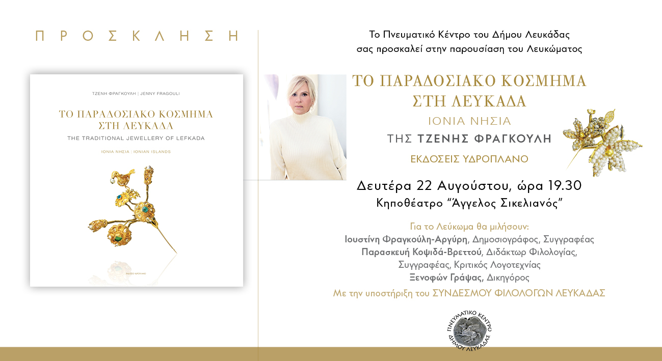 Το Πνευματικό Κέντρο του Δήμου Λευκάδας σας προσκαλεί στην παρουσίαση του λευκώματος «Το παραδοσιακό κόσμημα στη Λευκάδα» της Τζένης Φραγκούλη που θα γίνει την Δευτέρα 22 Αυγούστου, ώρα 19:30, στο Κηποθέατρο «Άγγελος Σικελιανός».