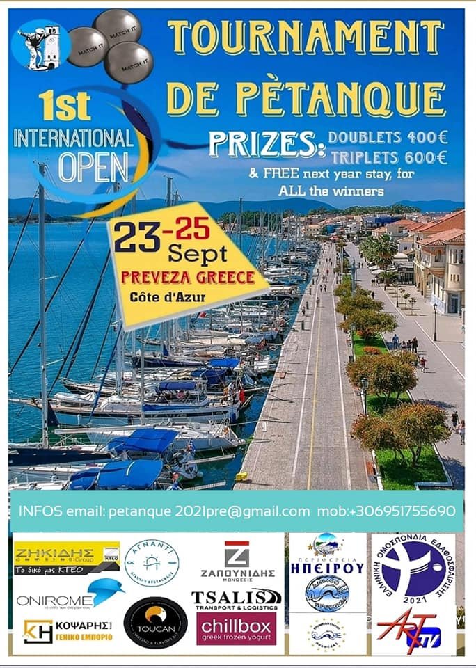 Το 1ο Διεθνές Τουρνουά Πετάνκ υπό την αιγίδα της Ελληνικής Ομοσπονδίας, της Περιφέρειας Ηπείρου και του Δήμου Πρέβεζας είναι γεγονός και θα πραγματοποιηθεί 23 με 25 Σεπτεμβρίου στα γήπεδα της Κυανής Ακτής, στην Πρέβεζα.