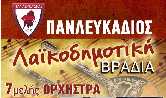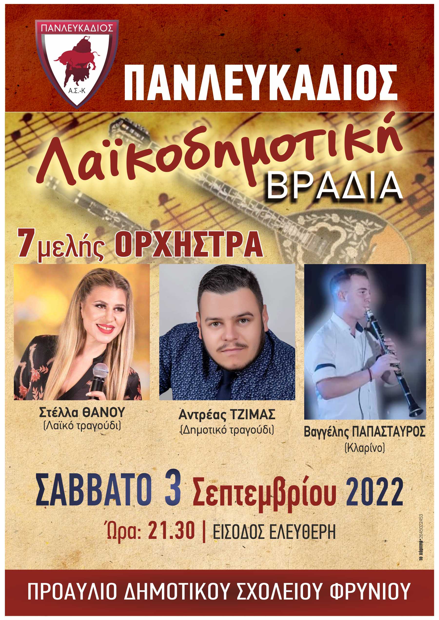 Λαϊκοδημοτική βραδιά με 7μελή ορχήστρα διοργανώνει με ελεύθερη είσοδο το Σάββατο 3 Σεπτεμβρίου 2022 στις 21:30 στο προαύλιο του Δημοτικού Σχολείου Φρυνίου ο Πανλευκάδιος.