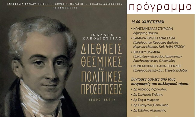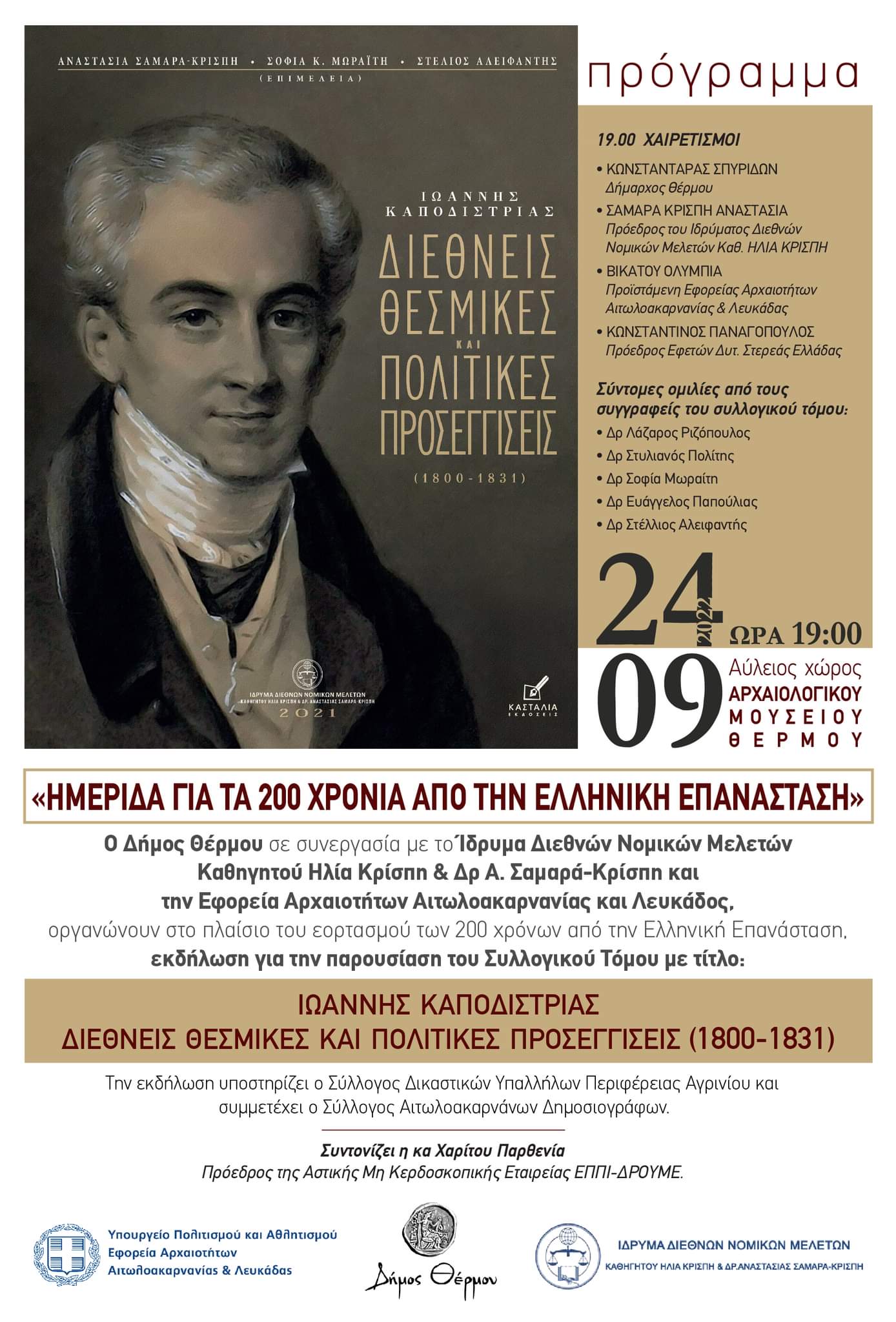 Η Εφορεία Αρχαιοτήτων Αιτωλοακαρνανίας και Λευκάδας σε συνεργασία με τον Δήμο Θέρμου και το Ίδρυμα Διεθνών Νομικών Σπουδών Καθηγητού Ηλία Κρίσπη & Δρ Α. Σαμαρά – Κρίσπη, καθώς και με την υποστήριξη του Συλλόγου Δικαστικών Υπαλλήλων Περιφέρειας Αγρινίου και τη συμμετοχή του Συλλόγου Αιτωλοακαρνάνων Δημοσιογράφων, πραγματοποιεί παρουσίαση του συλλογικού τόμου «Ιωάννης Καποδίστριας. Διεθνείς Θεσμικές και Πολιτικές Προσεγγίσεις (1800-1831)».