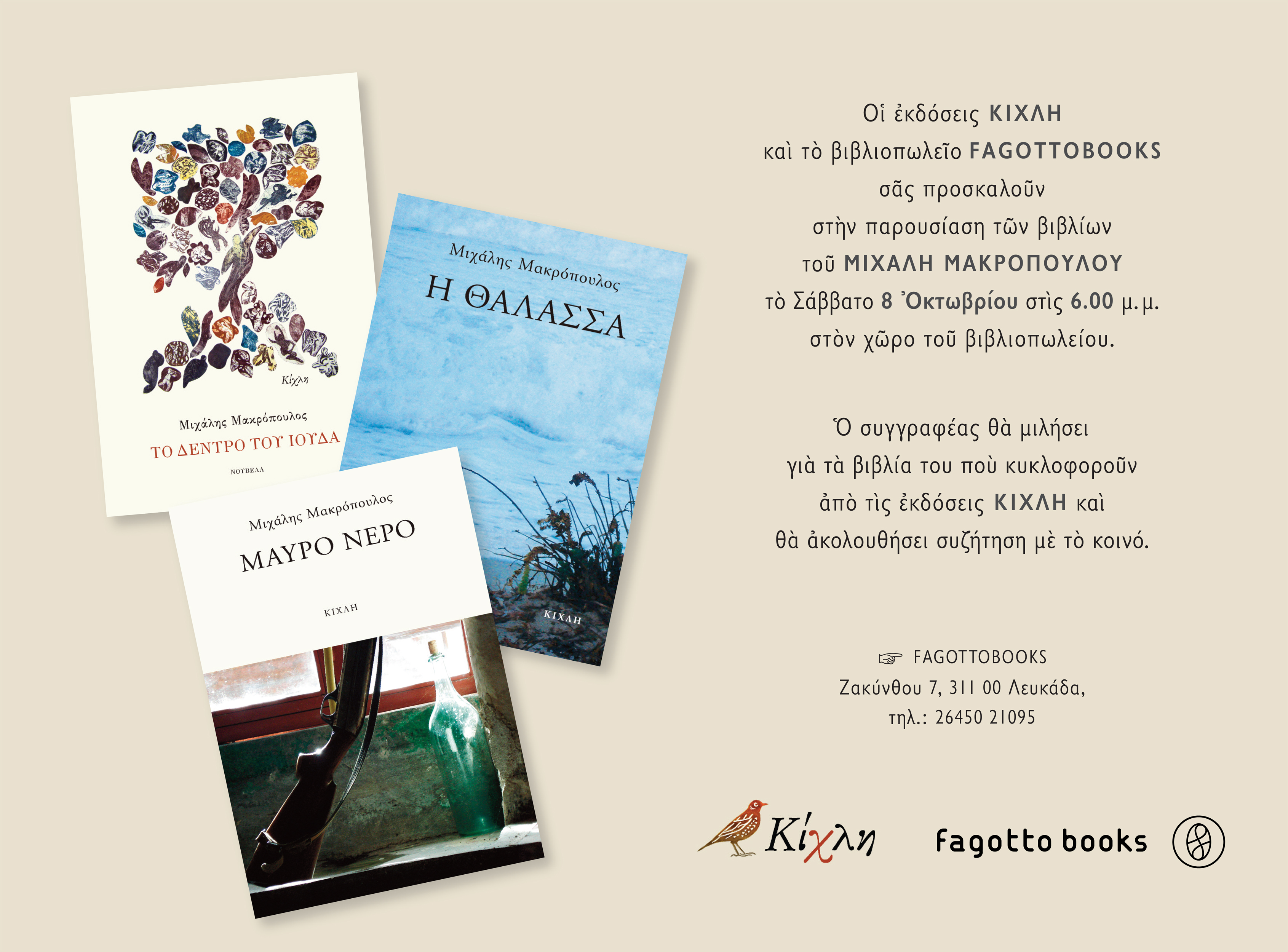 Το βιβλιοπωλείο Fagottobooks στη Λευκάδα με χαρά σας προσκαλεί στον χώρο του, το Σάββατο 8/10/2022 στις 6:00 το απόγευμα, στην παρουσίαση των βιβλίων του συγγραφέα και μεταφραστή Μιχάλη Μακρόπουλου, που κυκλοφορούν από τις εκδόσεις Κίχλη.