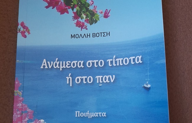 Πριν λίγες μέρες διάβασα την 7η ποιητική συλλογή της Αγρινιώτισσας ποιήτριας Μόλλης Βότση, που κυκλοφόρησε πρόσφατα. Με συγκίνησε με τη ζεστή της αφιέρωση και πρόσεξα ιδιαίτερα τον τίτλο «Ανάμεσα στο τίποτα ή στο παν» και το όμορφο εξώφυλλο, τοπίο από την Τριχωνίδα! Η ποιήτρια έχει εκδώσει εκτός από ποιήματα και το μυθιστόρημα «χάρτινο καράβι» με έντονο κοινωνικό προβληματισμό. Χαρακτηρίζεται από αγάπη για το γενέθλιο τόπο της και έντονη δράση στα πολιτιστικά δρώμενα, αφού για χρόνια είναι πρόεδρος των εν Αθήναις Αγρινιωτών. «Τότε, που ήμασταν παιδιά, γυρίζαμε στους δρόμους/ πότε στο Πάρκο, στην Πλατεία ή στο Σιντριβάνι/ στις γειτονιές που ευωδιάζαν γιασεμί κι αγιόκλημα/………/ είναι αξέχαστα τα χρόνια εκείνα στο Αγρίνιο…» (Στο Αγρίνιο κάποτε) και «Πώς θα ‘θελα να ‘μασταν πλάι στη λίμνη κάτω απ’ το πλατάνι / ψηλά να λάμπει, ολόλαμπρος, ο ήλιος κι ο ουρανός…» (Τριχωνίδα).