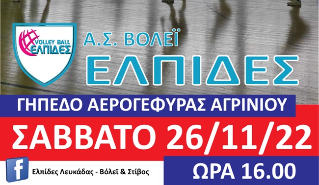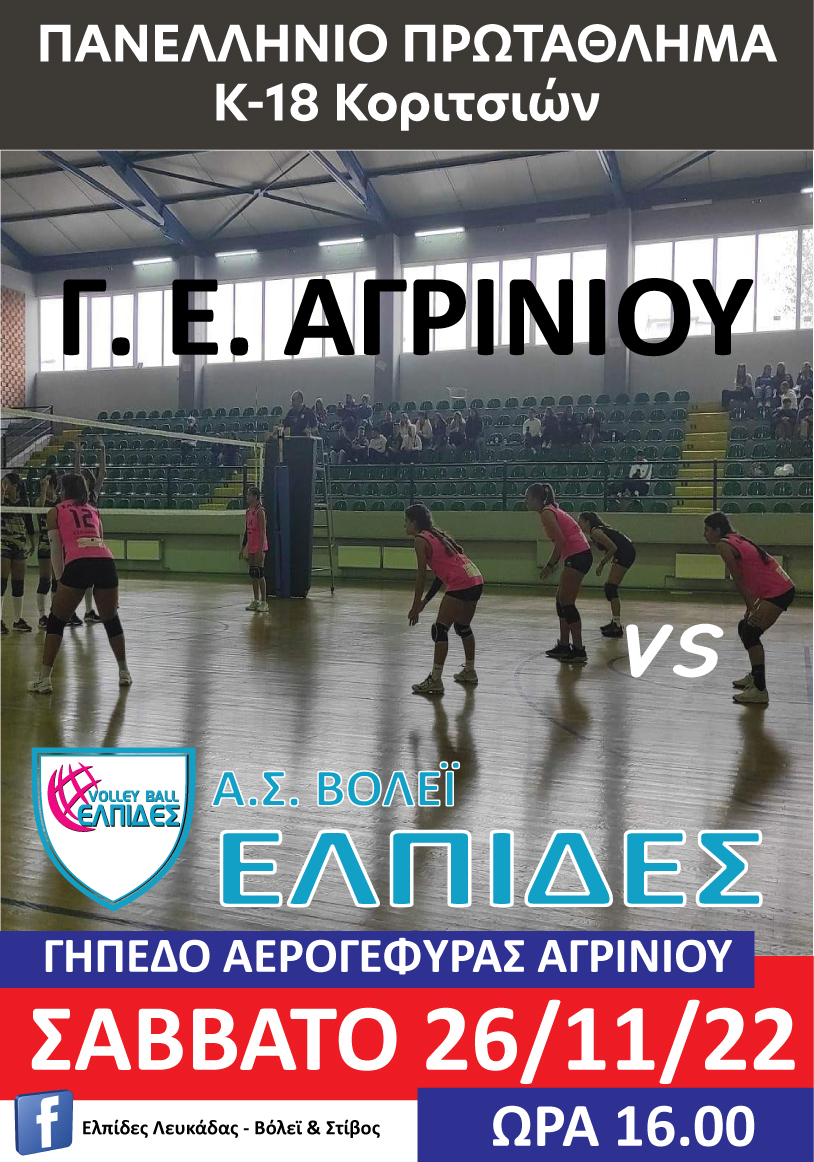 Το Σάββατο 26 Νοέμβρη 2022, στις 4:00 το απόγευμα, στο Γήπεδο Αερογέφυρας Αγρινίου, η ομάδα Κορασίδων του ΑΣ Βόλεϊ Ελπίδες θα αγωνιστεί με την ΓΕ Αγρινίου στο πλαίσιο του πανελληνίου πρωταθλήματος Κ-18 Κοριτσιών.