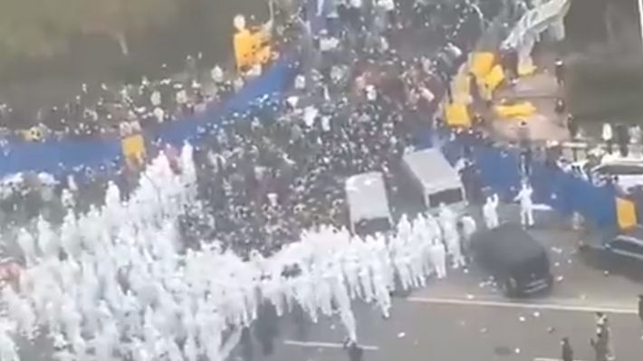 Έγιναν συγκρούσεις με αστυνομικούς που φόραγαν ολόσωμες λευκές προστατευτικές στολές και κράταγαν ασπίδες πάνω από τα κεφάλια τους για να μη τους χτυπήσουν αντικείμενα που εκτοξεύονταν εναντίον τους, όπως δείχνουν πλάνα που κυκλοφορούν στο διαδίκτυο.