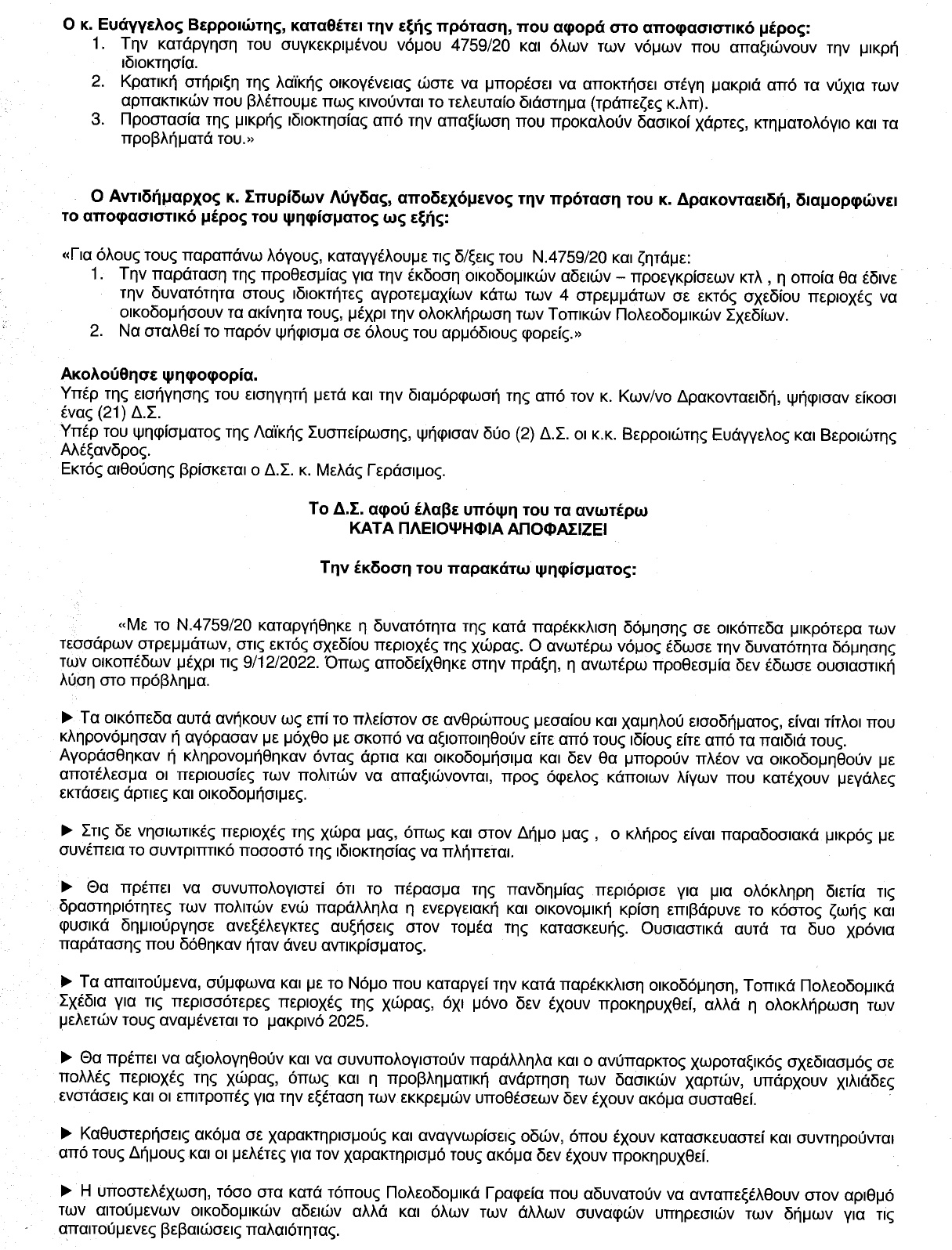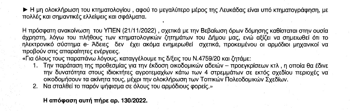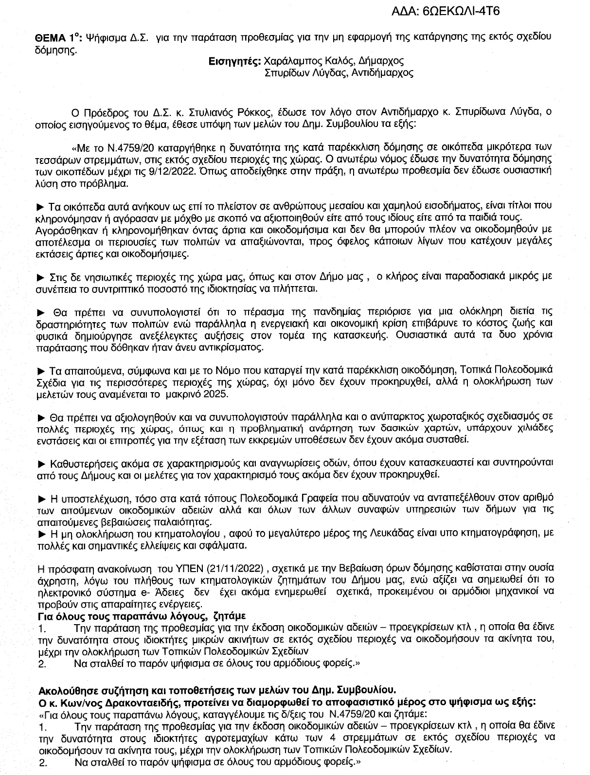 Ψήφισμα του Δημοτικού Συμβουλίου Λευκάδας στη συνεδρίαση της 24ης Νοεμβρίου 2022 για την παράταση προθεσμίας για την μη εφαρμογή της κατάργησης της εκτός σχεδίου δόμησης: