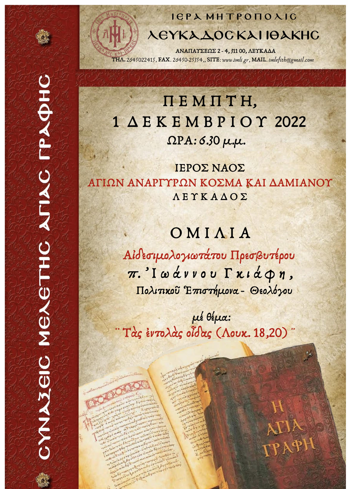 Όπως ενημερώνει η Μητρόπολη Λευκάδας και Ιθάκης, την Πέμπτη 1 Δεκεμβρίου 2022, στις 6:30 μ.μ., στον ΙΝ Αγίων Αναργύρων Κοσμά και Δαμιανού στην πόλη της Λευκάδας, στο πλαίσιο των συνάξεων μελέτης της Αγίας Γραφής, θα μιλήσει ο Αιδεσιμολογιώτατος Πρεσβύτερος π. Ιωάννης Γκιάφης, Πολιτικός Επιστήμονας-Θεολόγος, με θέμα «Τας εντολάς οίδας (Λουκ. 18-20)».