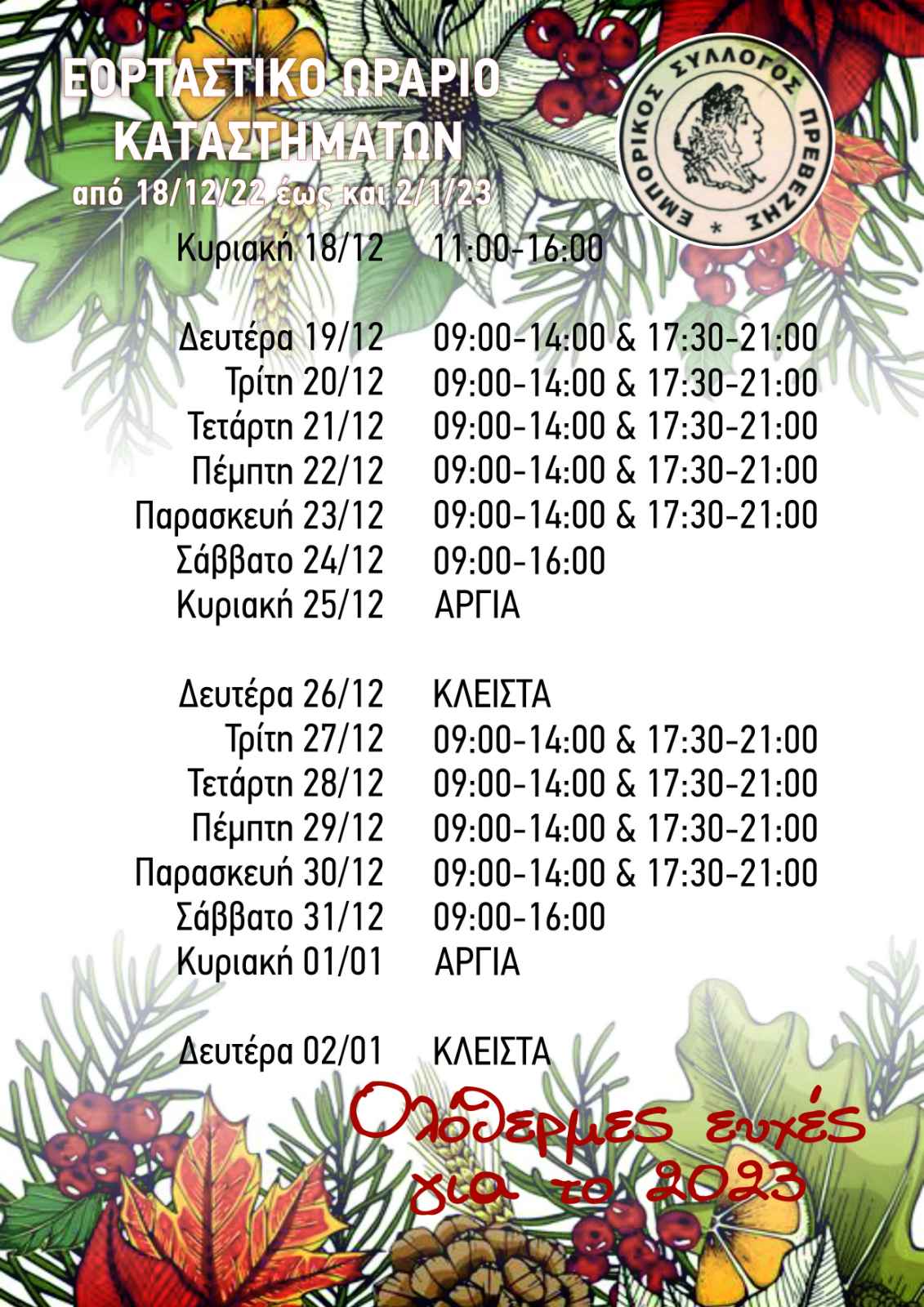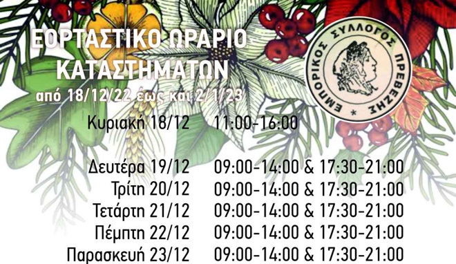 Το εορταστικό ωράριο (από 18.12.2022-02.01.2023) των καταστημάτων στην Πρέβεζα, όπως αυτό ανακοινώνεται από τον Εμπορικό Σύλλογο Πρέβεζας.