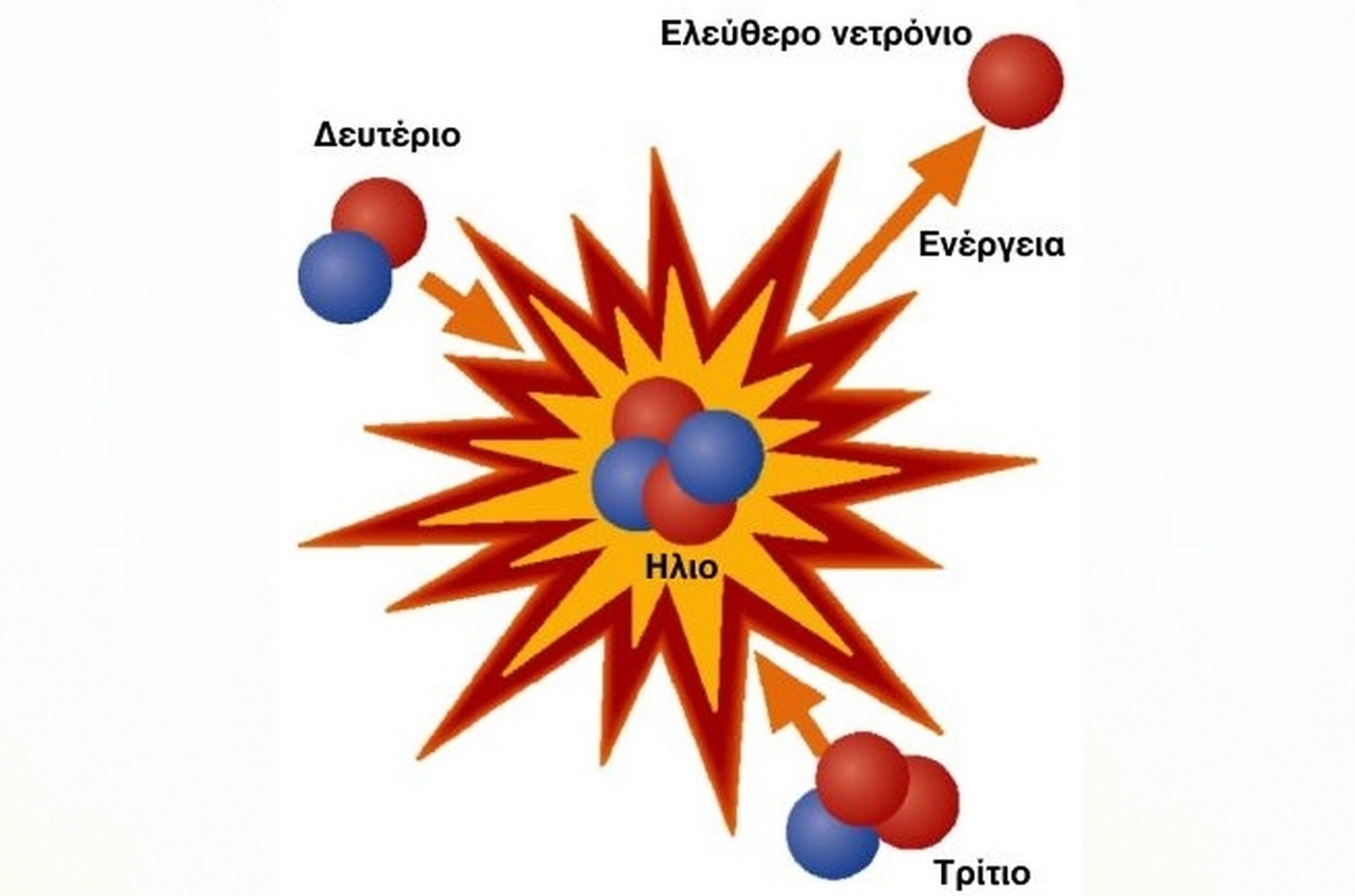syntixiΚατά την αντίδραση σύντηξης δευτερίου και τριτίου παράγονται ήλιο και ένα ελεύθερο νετρόνιο, ενώ απελευθερώνεται σημαντική ποσότητα Ενέργειας
