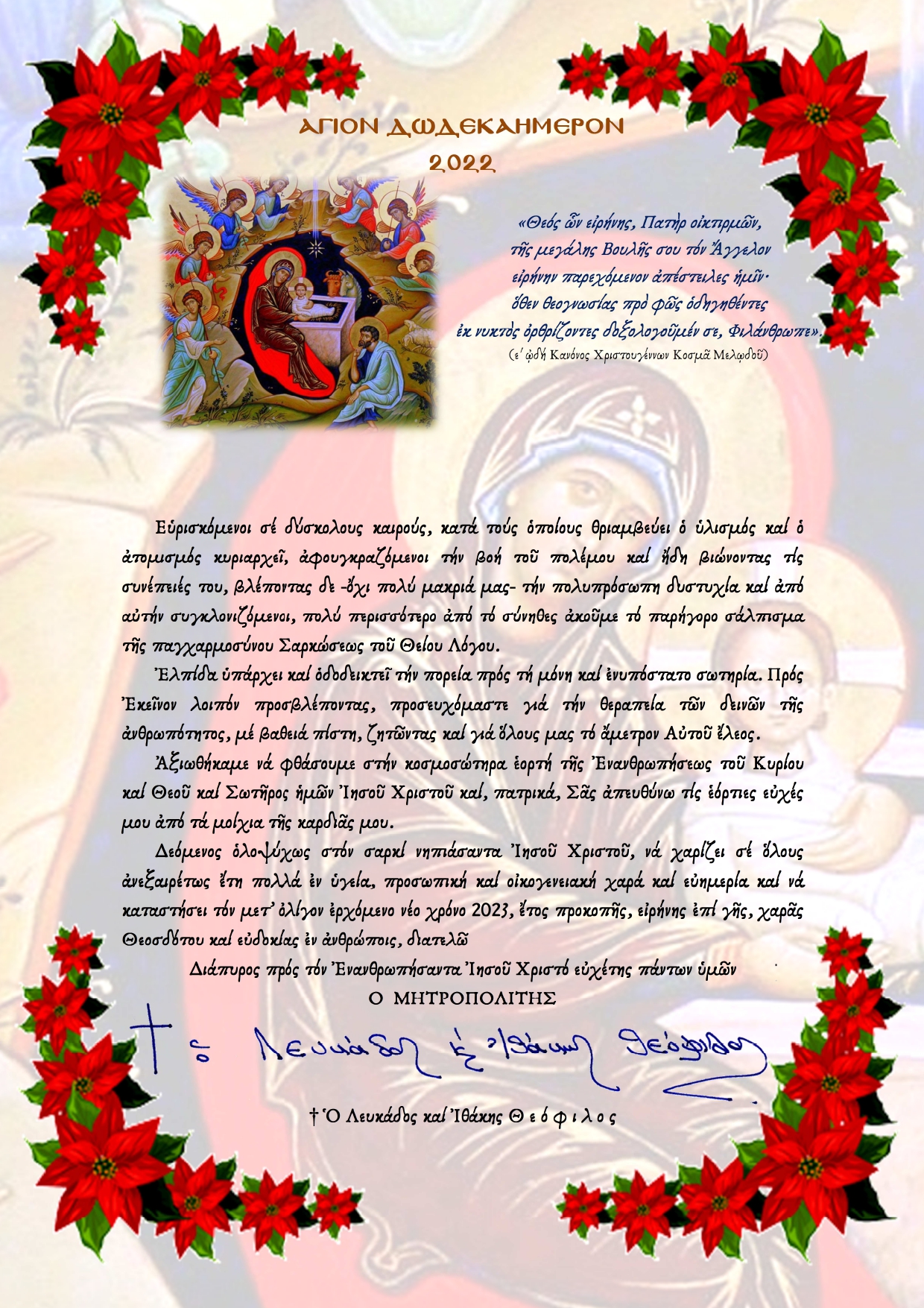 Ο Σεβασμιώτατος Μητροπολίτης Λευκάδος και Ιθάκης κύριος κ. Θεόφιλος και φέτος δεν θα αποστείλει μέσω των Ελληνικών Ταχυδρομείων ιδιαίτερες προσωπικές επιστολές με τις ευχές του, εν όψει των Χριστουγέννων και της ελεύσεως του νέου έτους 2023, ως είθισται, παρά μόνο διά του ηλεκτρονικού ταχυδρομείου.