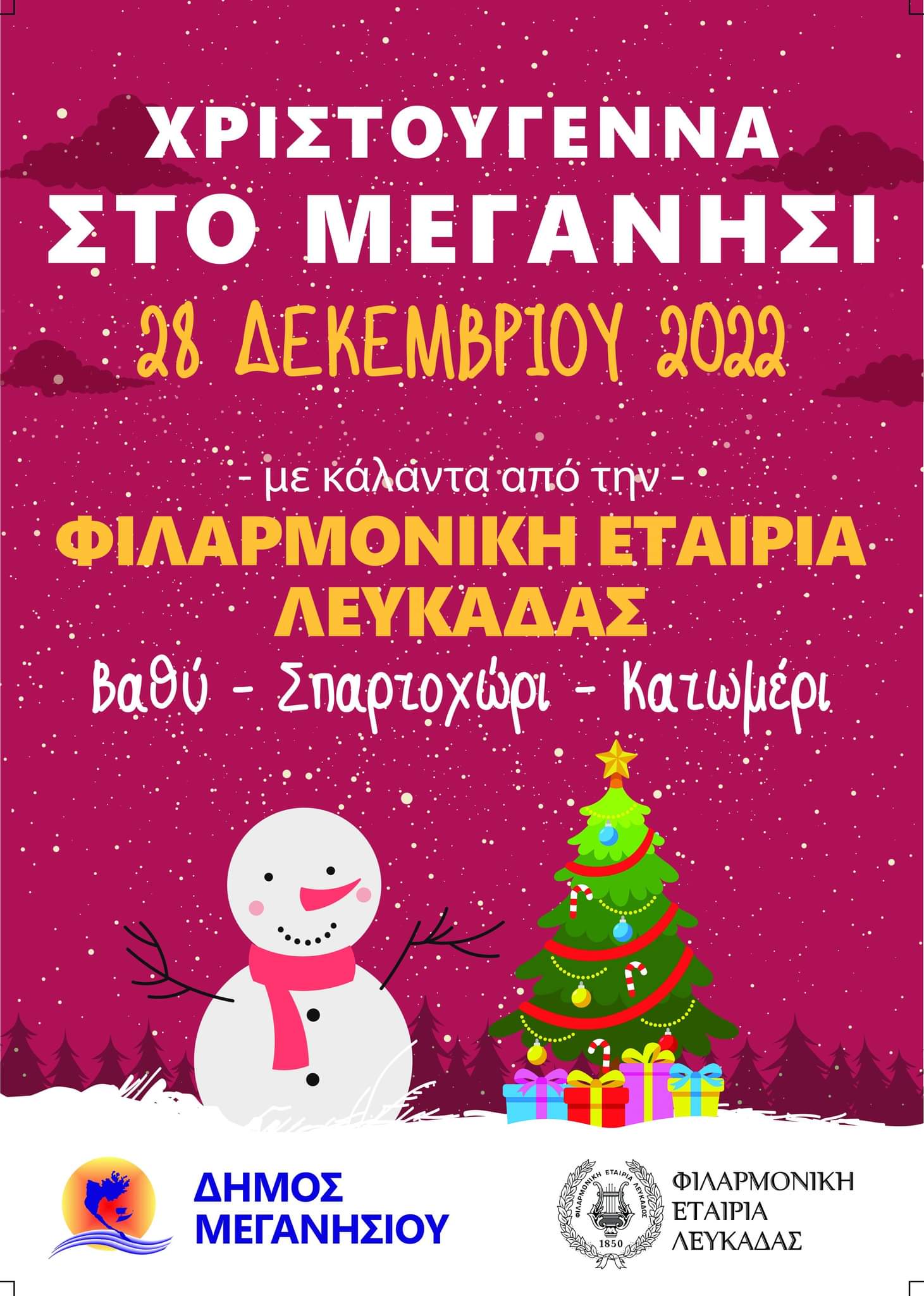 Όπως ανακοινώνει ο Δήμος Μεγανησίου, την Τετάρτη 28 Δεκέμβρη 2022 η Φιλαρμονική Εταιρεία Λευκάδας θα παιανίσει τα κάλαντα στο Βαθύ, Σπαρτοχώρι και Κατωμέρι.