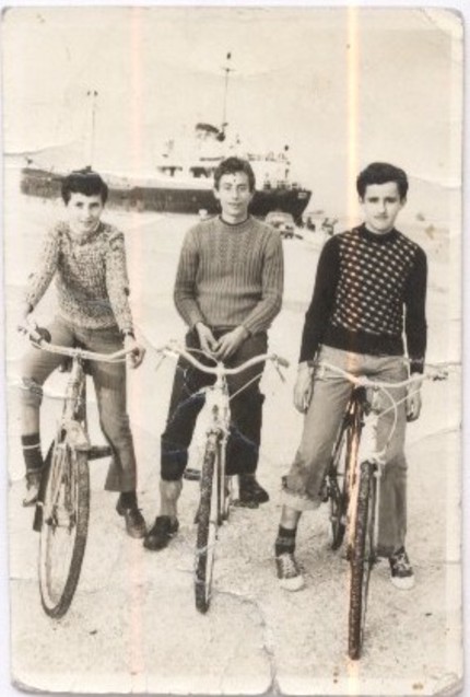[Βόλτα με νοικιασμένα ποδήλατα στην πόλη της Λευκάδας. Εδώ στο λιμάνι. Διακρίνονται από αριστερά ο Σπύρος Κ. Βλάχος («Μπόγος»), ο Βασίλης Σ. Μανωλίτσης («Τσίλιας») και ο Φίλιππος Γ. Κολυβάς]
