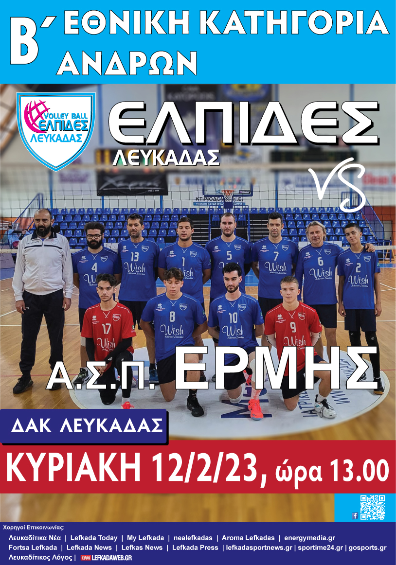 Την ομάδα του Α.Σ.Π. Ερμής θα αντιμετωπίσει την Κυριακή 12 Φλεβάρη 2023 , στις 1:00 μ.μ., στο ΔΑΚ Λευκάδας, η ανδρική ομάδα του ΑΣ Βόλεϊ Ελπίδες για την 8η αγωνιστική του πρωταθλήματος της Β΄ Εθνικής Ανδρών.