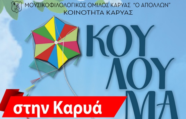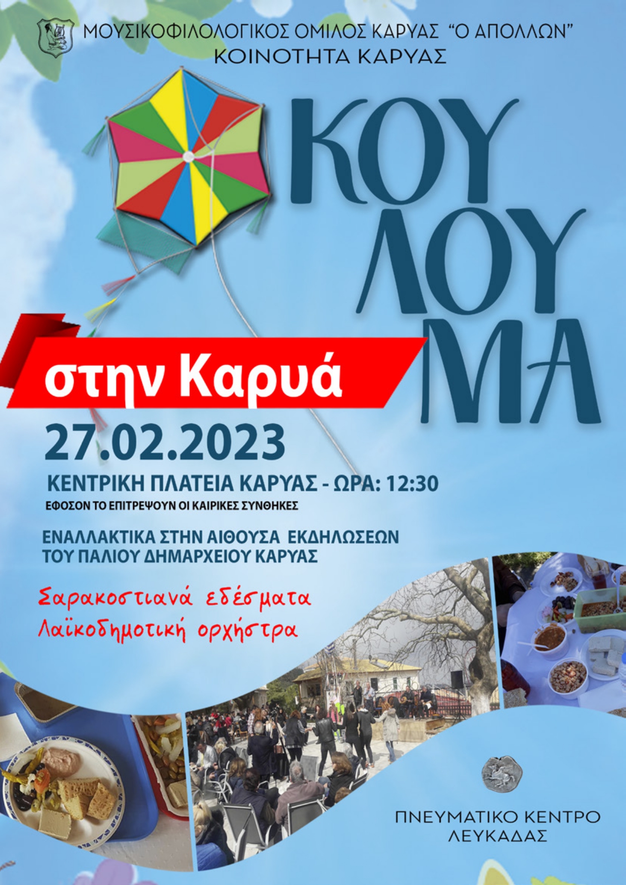 Ο Μουσικοφιλολογικός Όμιλος Καρυάς «Ο Απόλλων» και η Κοινότητα Καρυάς σε συνεργασία με τον Δήμο Λευκάδας καλούν την Καθαρά Δευτέρα 27.02.2023, στις 12:30, στην πλατεία Καρυάς (εφόσον το επιτρέψουν οι καιρικές συνθήκες και εναλλακτικά στην αίθουσα εκδηλώσεων του παλιού Δημαρχείου Καρυάς), για τον εορτασμό των Κούλουμων.