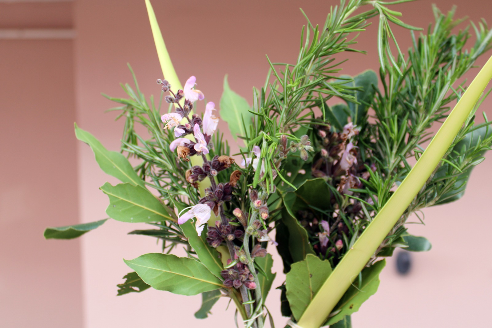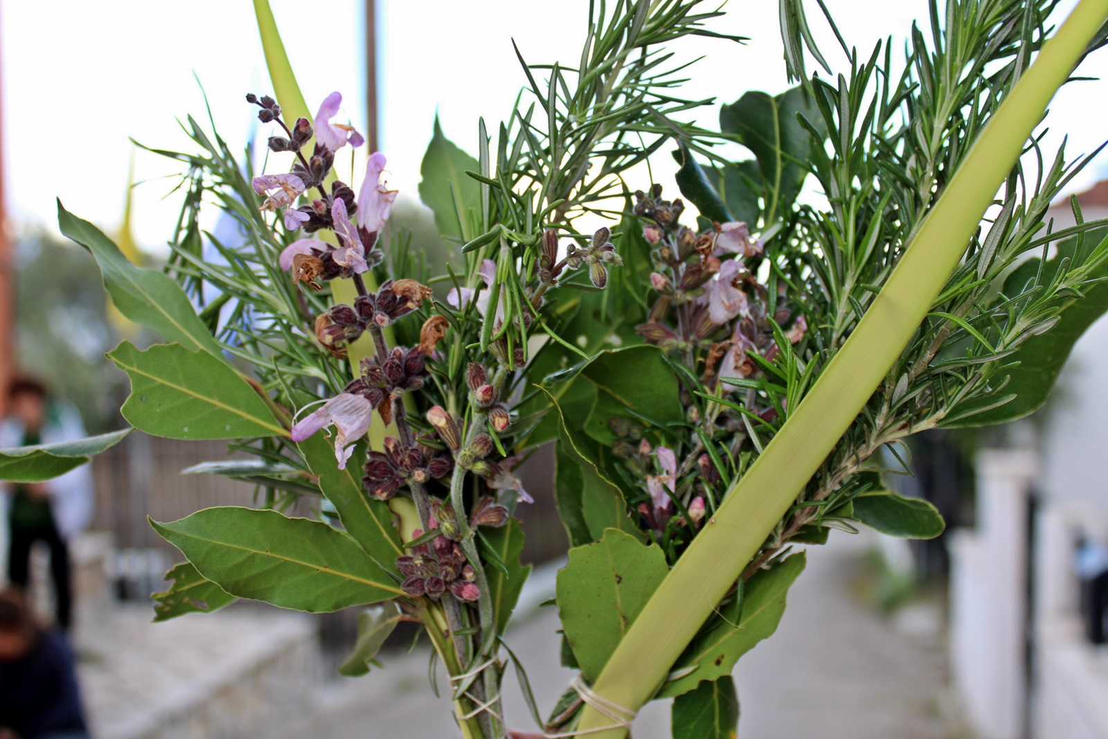 Το κάθε ματσάκι έχει αλιφασκιά, δάφνη, δεντρολίβανο και ένα φυλλαράκι φοίνικα. Τα βάγια συνηθίζονταν παλιά στα χωριά μας να τα κρεμούν οι μανάδες μας όλο το χρόνο πάνω από τα εικονίσματα του σπιτιού.
