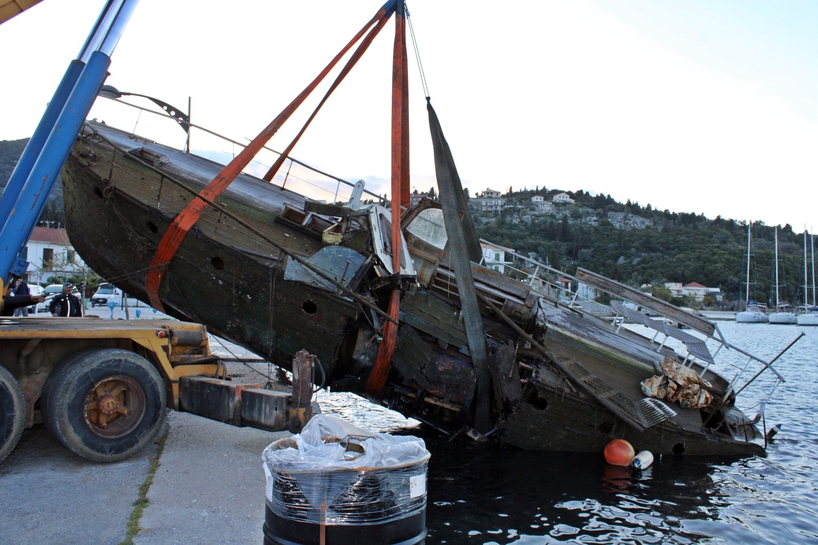 Η ανέλκυση η οποία έγινε παρουσία εκπροσώπων της Λιμενικής αρχής και του Δημάρχου Λευκάδας, κ. Χαράλαμπου Καλού, ο οποίος προΐσταται και του Δημοτικού Λιμενικού Ταμείου, ήταν να γίνει το πρωί της Παρασκευής αλλά έσκασε το λάστιχο του γερανού με αποτέλεσμα μεταφερθεί για το απόγευμα της ίδιας μέρας.