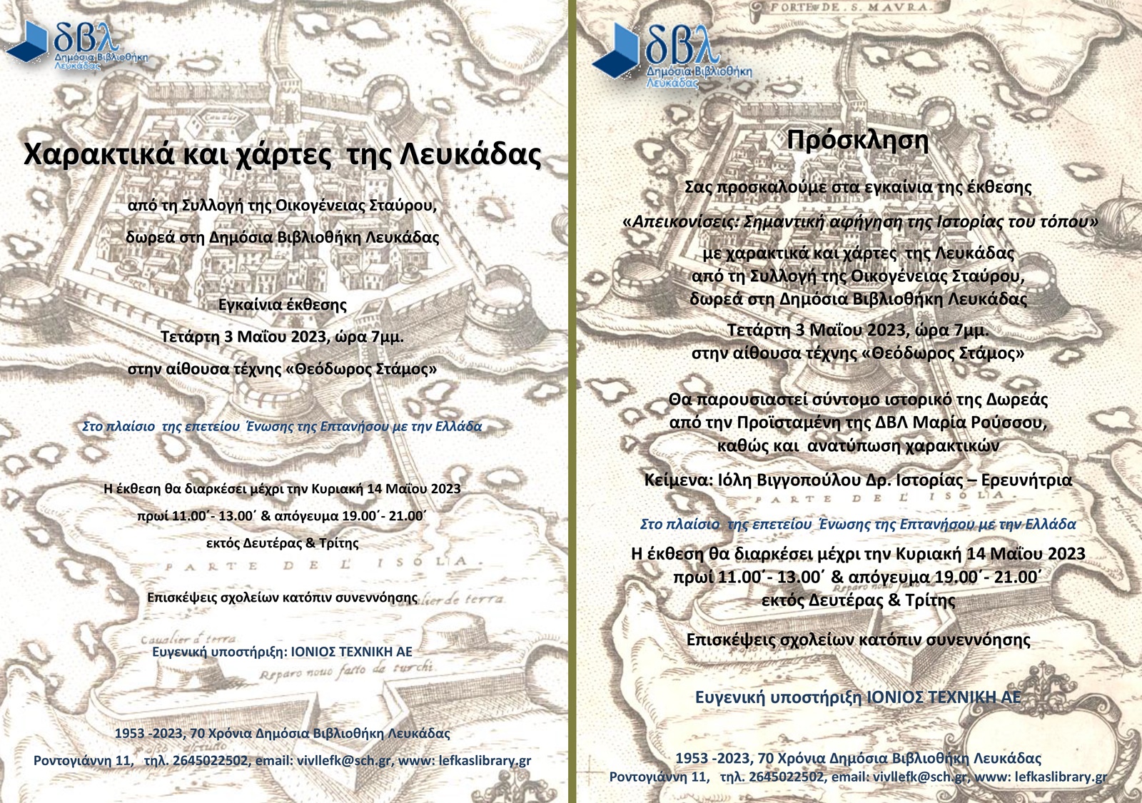 Στο πλαίσιο της επετείου της Ένωσης της Επτανήσου με την Ελλάδα, η Δημόσια Βιβλιοθήκη Λευκάδας σας προσκαλεί στην έκθεση «Απεικονίσεις: Σημαντική αφήγηση της ιστορίας του τόπου», με χαρακτικά και χάρτες της Λευκάδας από τη συλλογή της οικογένειας Σταύρου, δωρεά στη Δημόσια Βιβλιοθήκη.