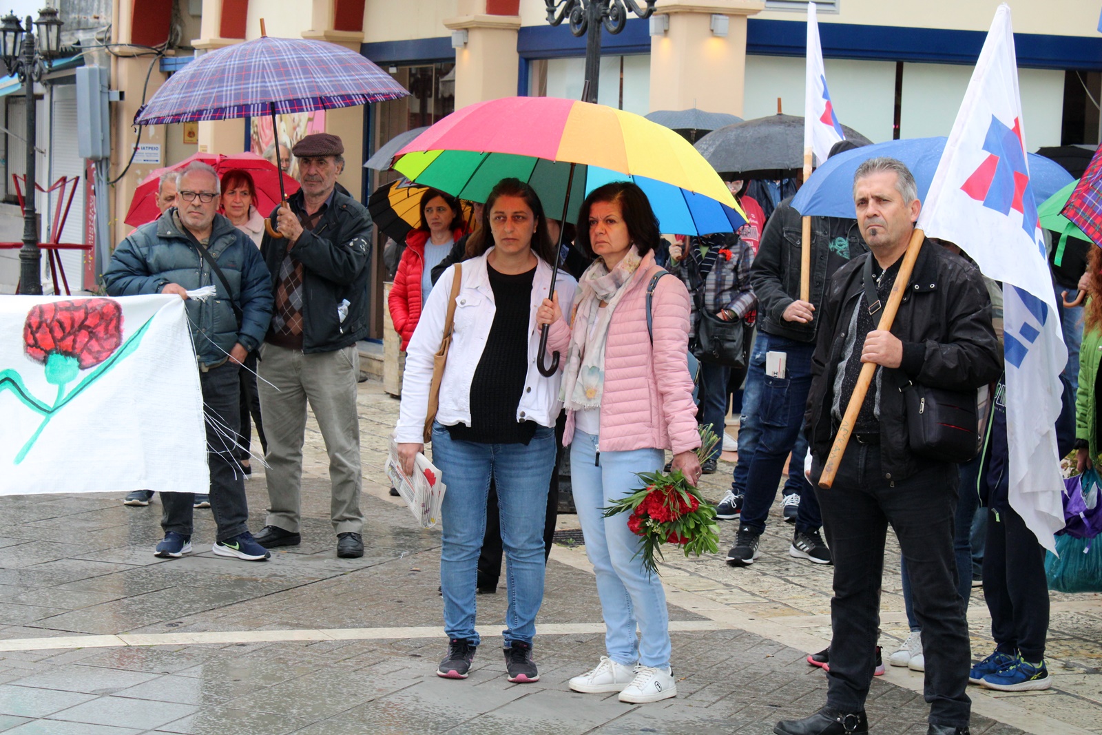 Μετά την συγκέντρωση ακολούθησε πορεία κατά μήκος της κεντρικής αγοράς με κατάληξη την πλατεία Μαρκά όπου έγινε κατάθεση στεφάνων στο Μνημείο. Εκ μέρους του Εργατικού Κέντρου το στεφάνι κατέθεσε ο Μανώλης Χαλέπης, μέλος της Διοίκησης και Πρόεδρος του Συλλόγου Ιδιωτικών Υπαλλήλων. Λουλούδια κατέθεσαν επίσης η Λαμπρινή Κρικώνη, εκ μέρους του Συλλόγου Εργαζομένων του Νοσοκομείου και η Έφη Κάτσενου, εκ μέρους του Σωματείου Εργαζομένων ΟΤΑ.