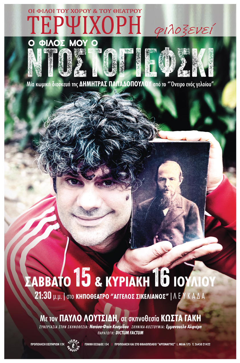 Το Σωματείο οι Φίλοι του Χορού και του Θεάτρου ΤΕΡΨΙΧΟΡΗ φιλοξενεί την θεατρική παράσταση «Ο φίλος μου ο Ντοστογιέφσκι» της Δήμητρας Παπαδοπούλου, με τον Παύλο Λουτσίδη και σε σκηνοθεσία Κώστα Γάκη, Σάββατο και Κυριακή 15 και 16 Ιουλίου 2023 στο Κηποθέατρο «Άγγελος Σικελιανός» και ώρα 21:30 μμ.
