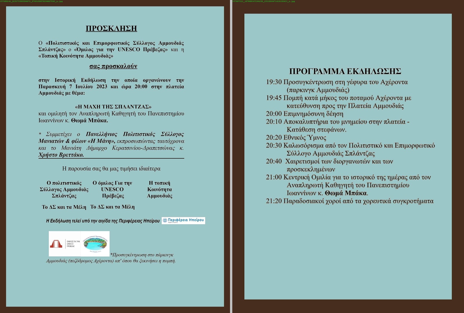 Την Παρασκευή 7 Ιουλίου 2023 και ώρα 20:00 οι συνεργαζόμενοι φορείς: «Πολιτιστικός και Επιμορφωτικός Σύλλογος Αμμουδιάς Σπλάντζας», «Όμιλος για την UNESCO Πρέβεζας» και «Τοπική Κοινότητα Αμμουδιάς» διοργανώνουν ιστορική εκδήλωση στην πλατεία Αμμουδιάς Πρέβεζας.
