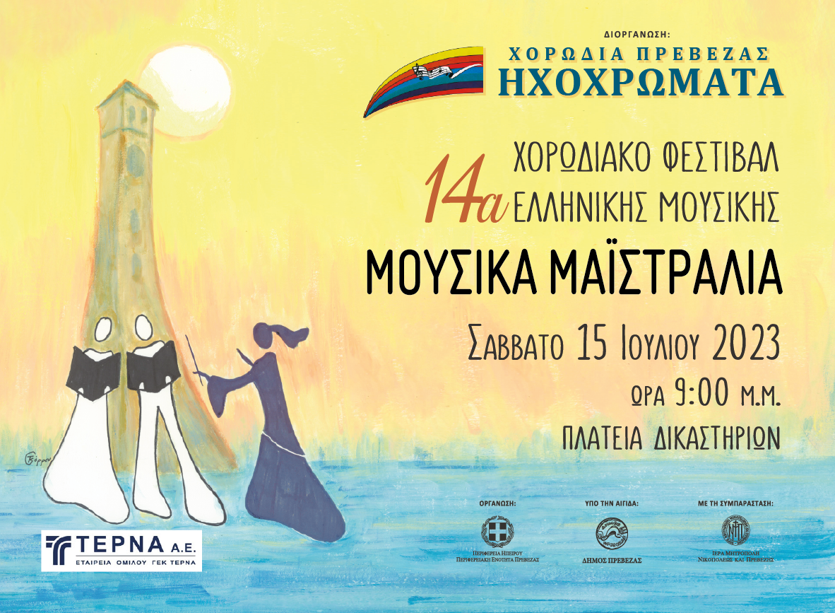 Η Χορωδία Πρέβεζας «ΗΧΟΧΡΩΜΑΤΑ» διοργανώνει για μια ακόμη χρονιά το Χορωδιακό Φεστιβάλ Ελληνικού Τραγουδιού και προσκαλεί όλους τους φίλους της Μουσικής, να παρακολουθήσουν τα 14α «ΜΟΥΣΙΚΑ ΜΑΪΣΤΡΑΛΙΑ», που θα πραγματοποιηθούν το Σάββατο 15 Ιουλίου 2023 και ώρα 9:00 στην Πλατεία Δικαστηρίων, στην παραλία της Πρέβεζας.
