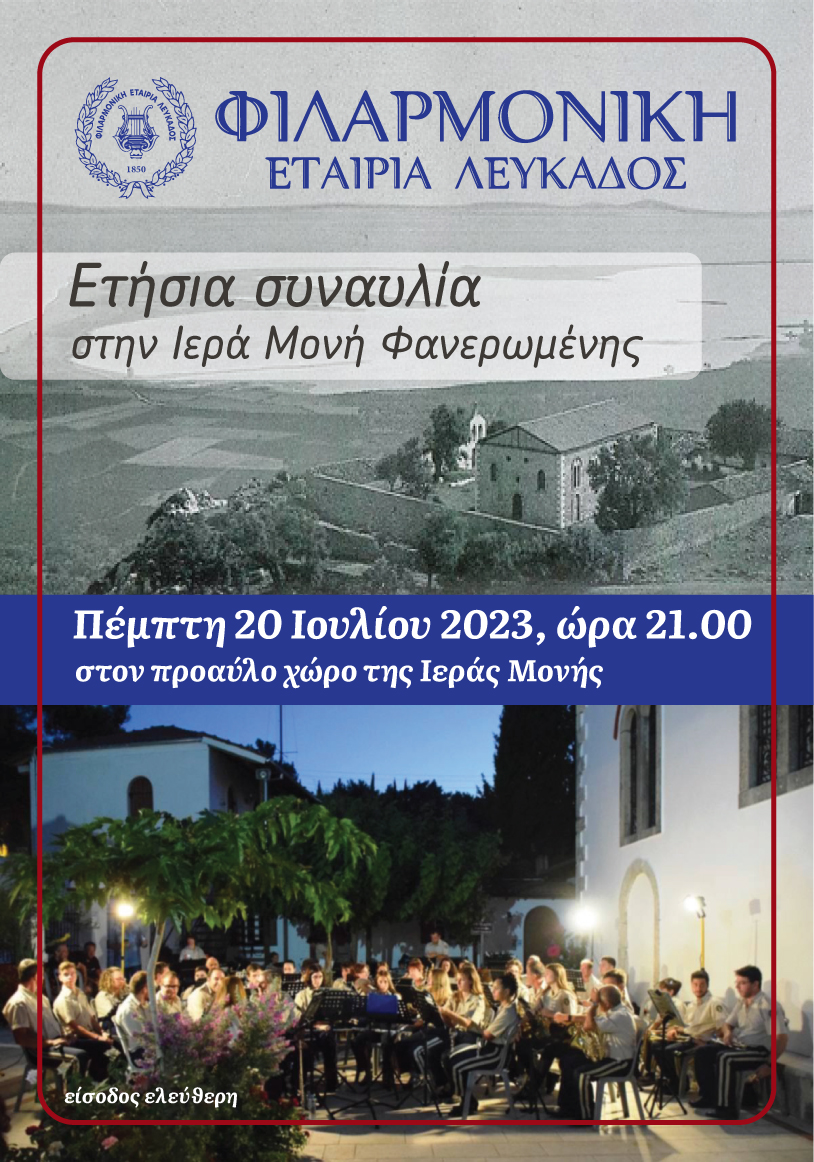 Το Δ.Σ. της Φιλαρμονικής Εταιρίας Λευκάδας σας προσκαλεί στην ετήσια συναυλία της Φ.Ε.Λ που θα πραγματοποιηθεί Πέμπτη 20 Ιουλίου 2023 και ώρα 21:00 στον προαύλιο χώρο της Ιεράς Μονής Φανερωμένης.