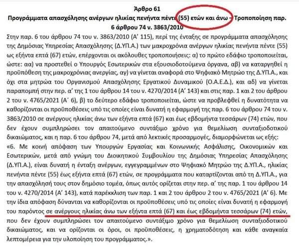 Συγκεκριμένα, στο Άρθρο 61 του νομοσχεδίου, με τίτλο «Προγράμματα απασχόλησης ανέργων ηλικίας πενήντα πέντε (55) ετών και άνω – Τροποποίηση παρ. 6 άρθρου 74 ν.3863/2010» προβλέπεται η δυνατότητα ένταξης στα προγράμματα και ανέργων άνω 67 ετών και μέχρι των 74 ετών (που δεν έχουν συμπληρώσει τον απαιτούμενο συντάξιμο χρόνο για θεμελίωση συνταξιοδοτικού δικαιώματος).
