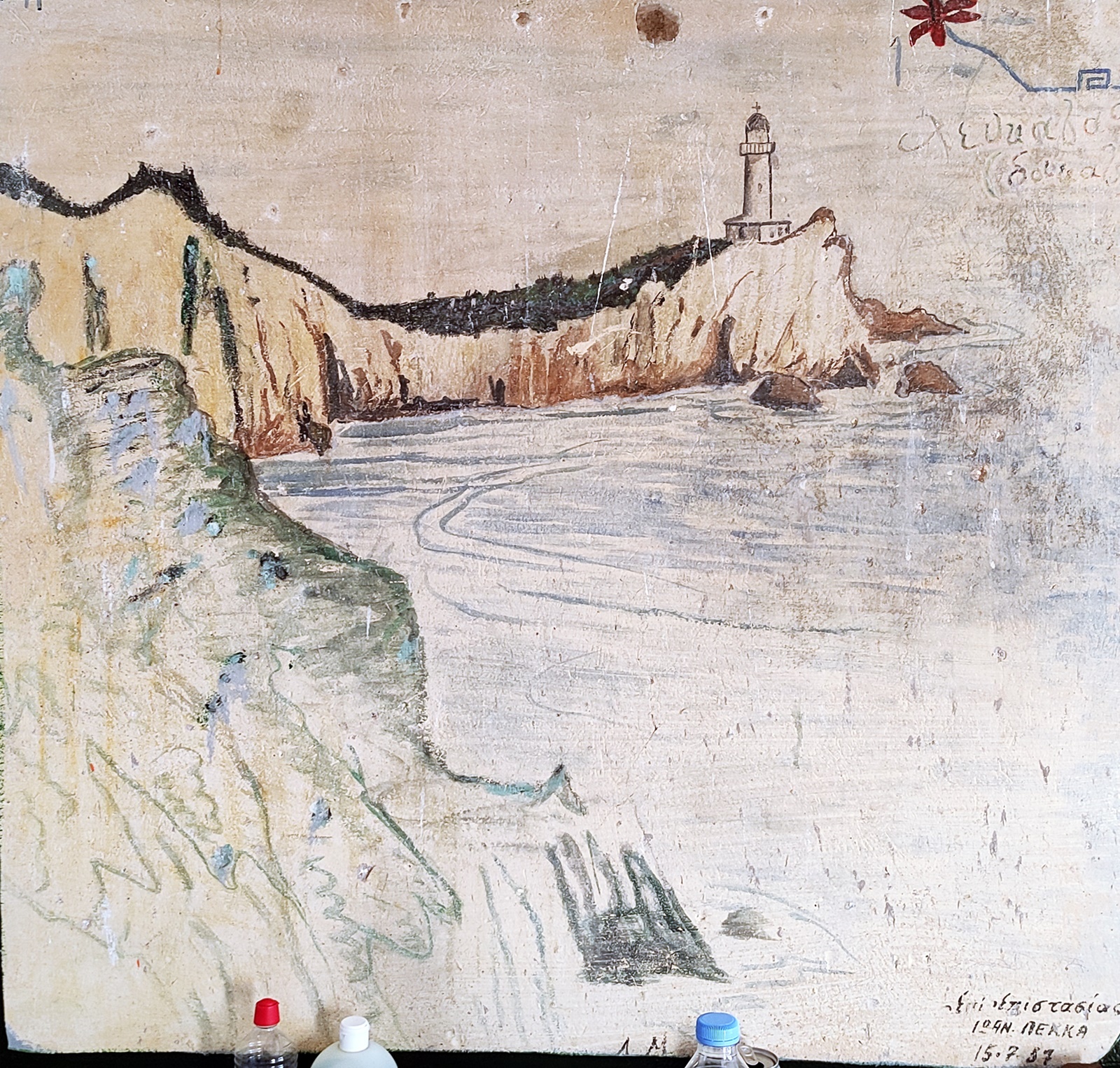 «… Απελπισμένοι ανεβαίνουμε στο φάρο και με μεγάλη προσπάθεια βγάζουμε ένα κομμάτι από το πάτωμα και την πίσω πόρτα και σιγά σιγά τα πάμε στη θάλασσα. Κυριολεκτικά «σανίς σωτηρίας» που λένε.