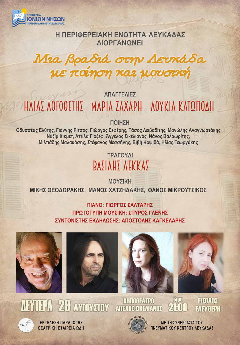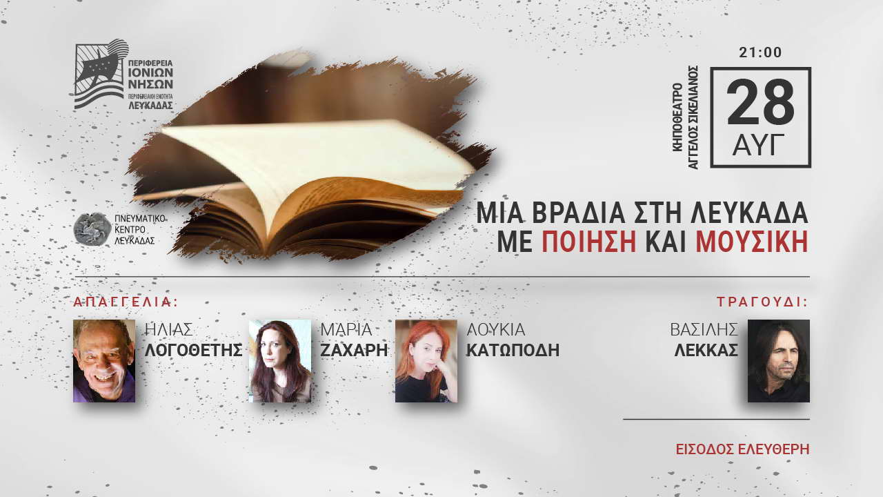 Απόψε (28/8/2023) το βράδυ η παράσταση λόγου και μουσικής «Μια βραδιά στη Λευκάδα με ποίηση και μουσική», που διοργανώνει η Περιφερειακή Ενότητα Λευκάδας, με τη συνεργασία του Πνευματικού Κέντρου Δήμου Λευκάδας.