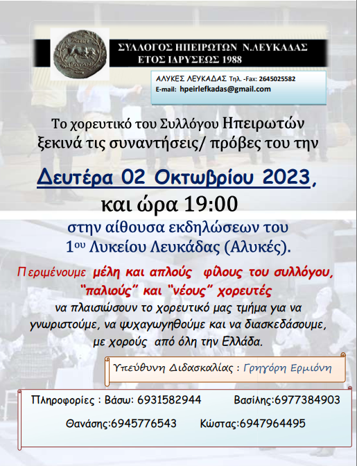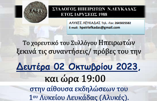 Το χορευτικό του Συλλόγου Ηπειρωτών Λευκάδας ξεκινά τις πρόβες του την Δευτέρα 2 Οκτωβρίου, στις 19:00, στην αίθουσα εκδηλώσεων του 1ου Λυκείου Λευκάδας (Αλυκές).