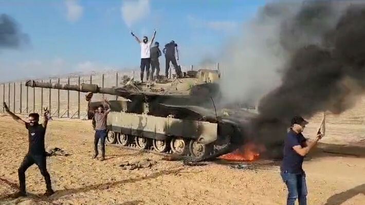 Παλαιστίνιοι πάνω σε κατεστραμμένο ισραηλινό τανκ (Πηγή φωτο: Twitter)