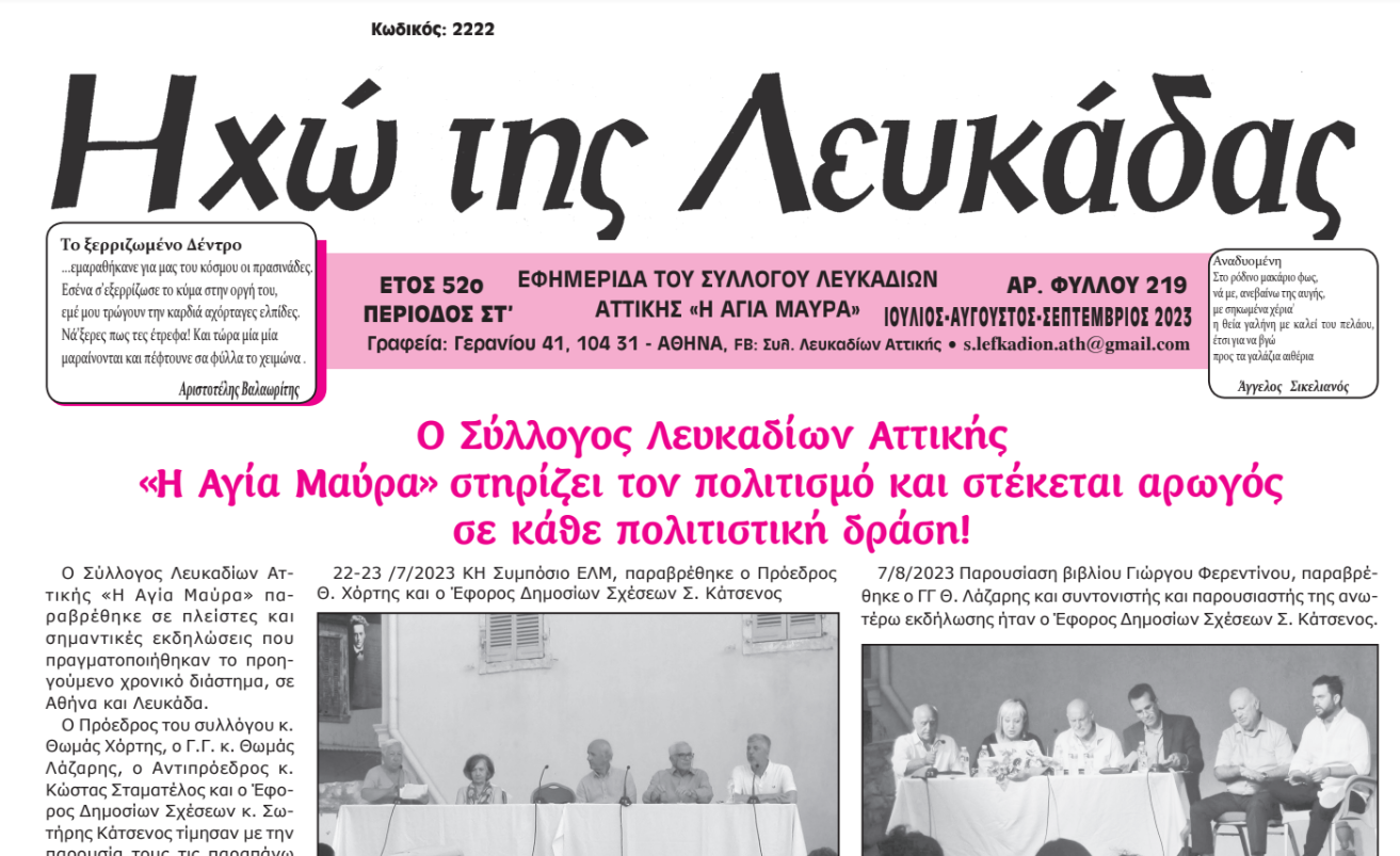 Κυκλοφόρησε το νέο φύλλο (Αριθ. Φύλλου 219, Ιούλιος, Αύγουστος, Σεπτέμβριος 2023) της εφημερίδας «Ηχώ της Λευκάδας» που εκδίδει κάθε τρεις μήνες ο Σύλλογος Λευκαδίων Αττικής «Η Αγία Μαύρα».